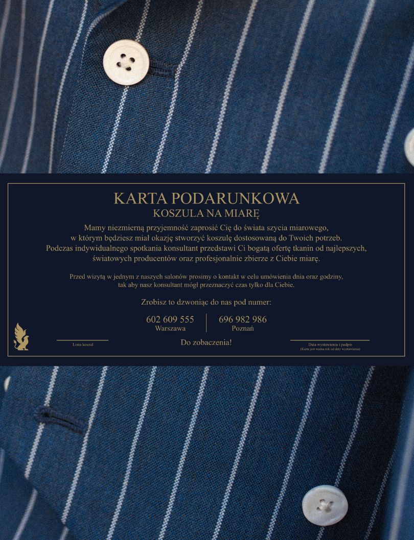 Elegancka karta podarunkowa w formie fizycznej doskonale sprawdzi się jako prezent na urodziny, rocznicę, święta lub każdą inną okazję, gdy chcesz podarować coś naprawdę osobistego i użytkowego – koszulę, która będzie służyć przez lata.