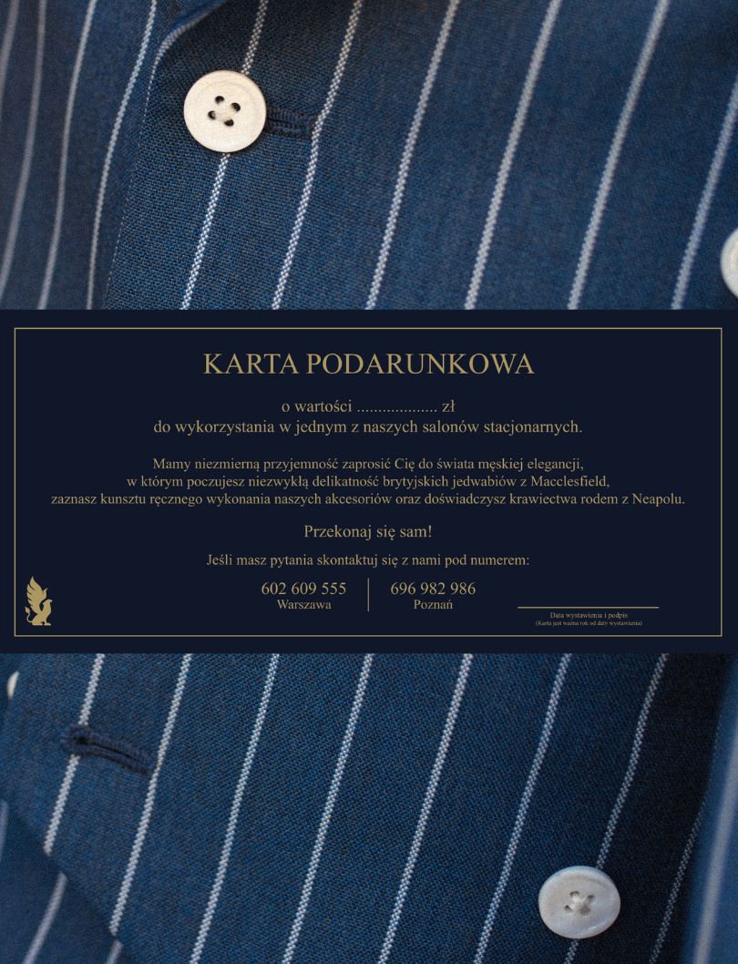 Wręczając tę kartę, zapraszasz do świata męskiej elegancji, w którym można poczuć niezwykłą delikatność brytyjskich jedwabiów z Macclesfield, docenić kunszt ręcznego wykonania naszych dodatków oraz doświadczyć krawiectwa inspirowanego neapolitańską szkołą szycia. Obdarowany sam wybierze to, czego najbardziej potrzebuje – czy będzie to nowa marynarka, starannie skrojone chinosy, czy jedwabny krawat lub poszetka.