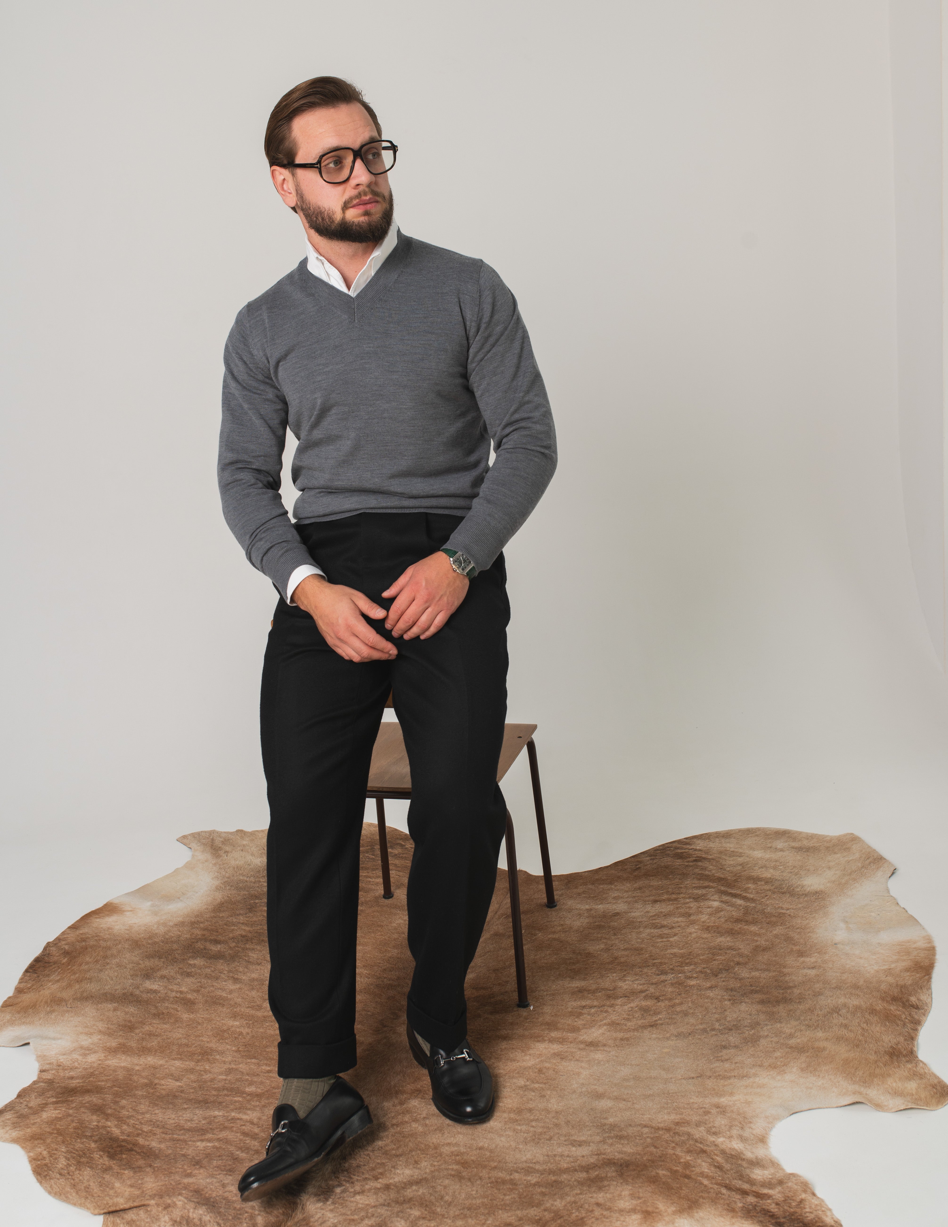 Grigio Velluto to kwintesencja elegancji w subtelnym, szarym odcieniu. Sweter z dekoltem V-neck, wykonany w 100% z ekskluzywnej wełny merynosów, zachwyca swoją lekkością i miękkością przypominającą delikatny aksamit. Szary melanż podkreśla jego uniwersalny charakter, dzięki czemu doskonale komponuje się zarówno z koszulą, jak i t-shirtem.