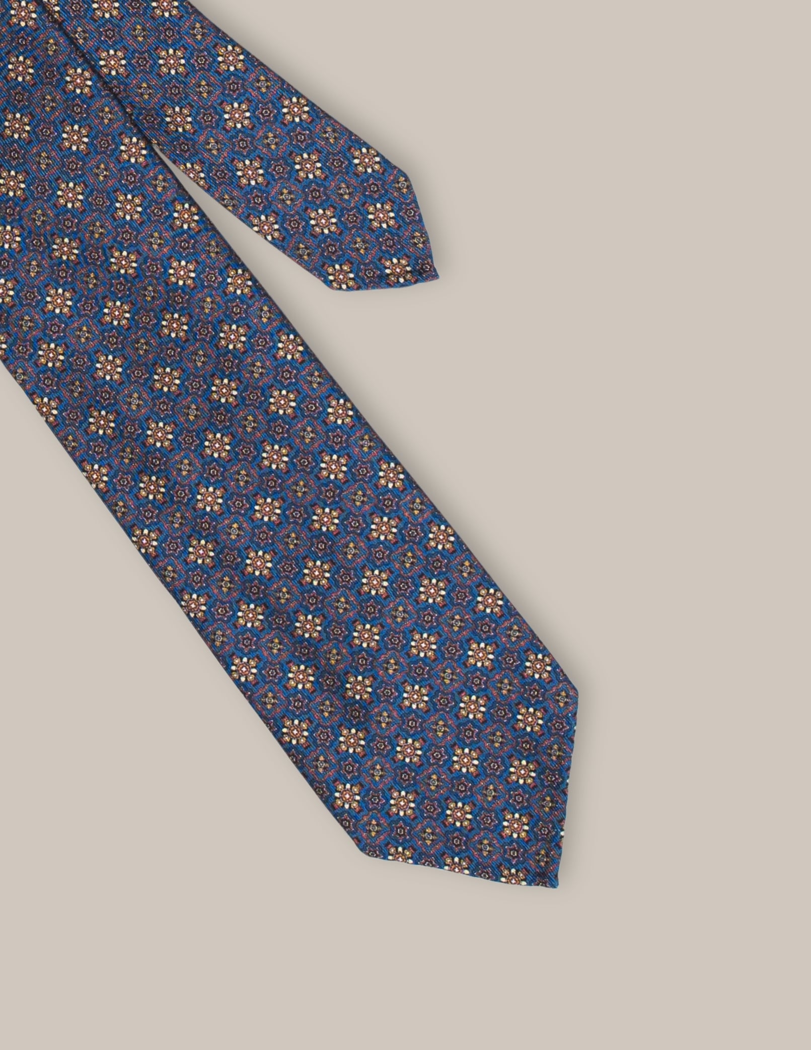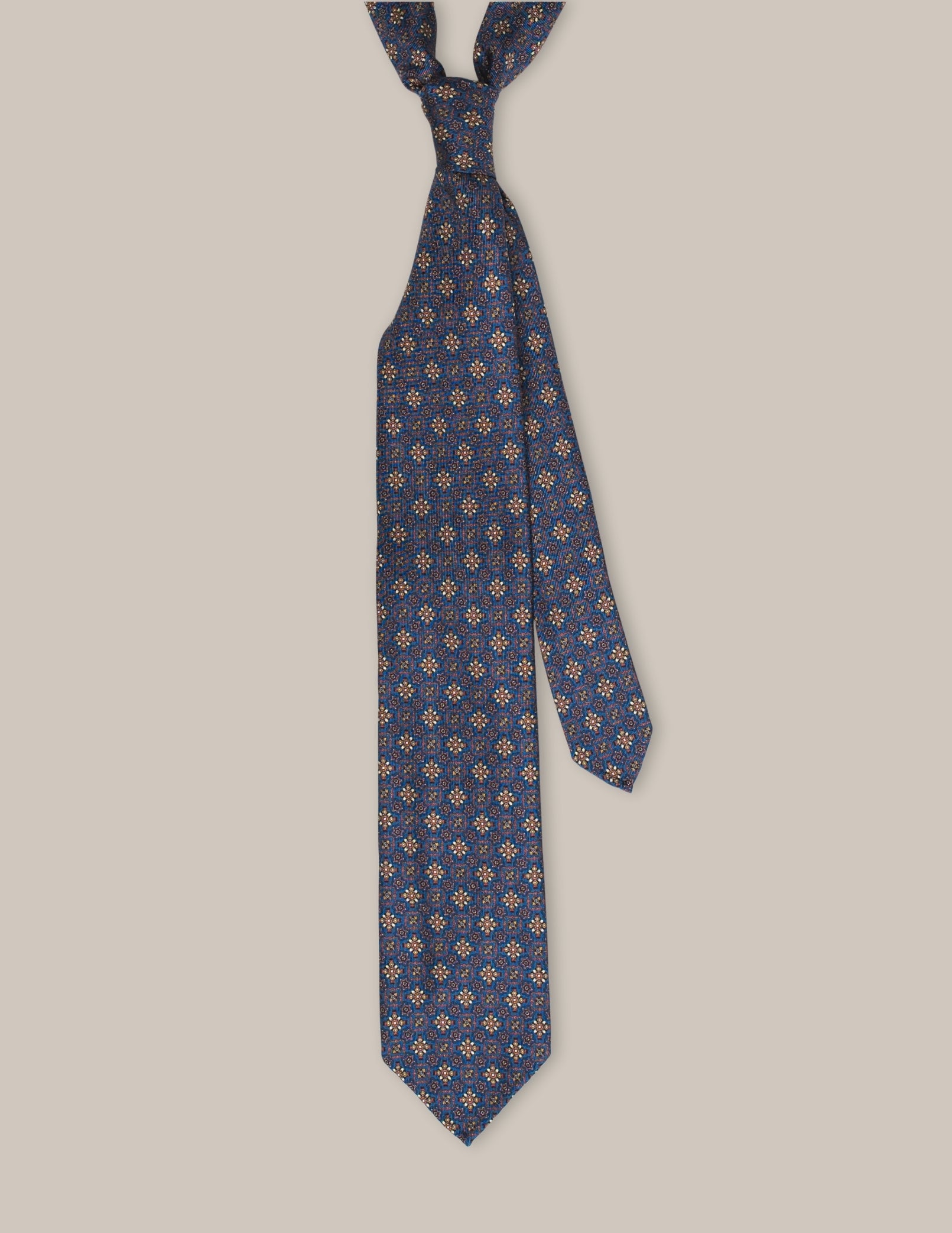 Krawat Blu Fiorito to połączenie klasycznego włoskiego rzemiosła z subtelnym, kwiatowym wzorem. Wykonany w całości z jedwabiu, uszyty w konstrukcji 3-fold, zachwyca głębokim odcieniem niebieskiego tła, na którym rozmieszczono delikatne kwiatowe detale w odcieniach złota, beżu i brązu. Ręcznie rolowane końcówki oraz brak podszewki podkreślają jego lekkość, a klasyczny wełniano-bawełniany wkład zapewnia doskonałe ułożenie węzła.