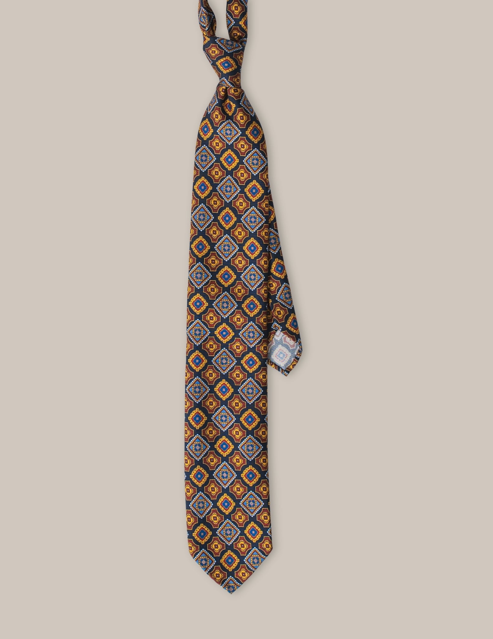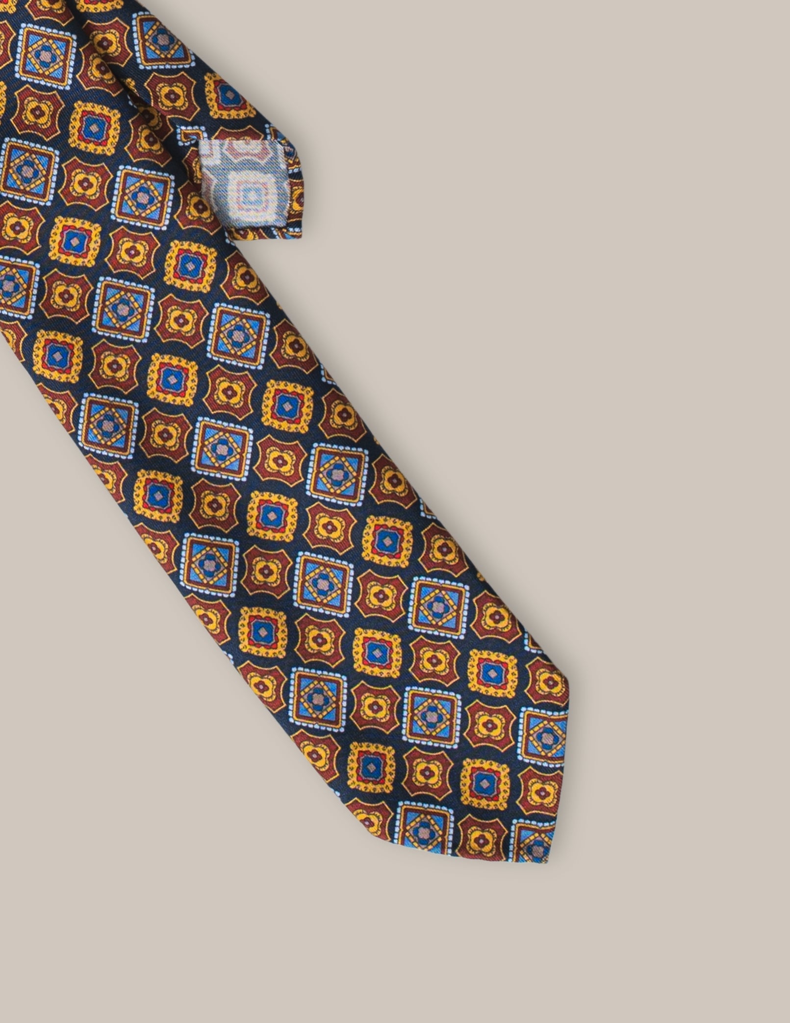 Krawat Blu Geometrico to wyjątkowy dodatek, który łączy elegancki design z mistrzowskim włoskim rzemiosłem. Wykonany w całości z jedwabiu, uszyty w konstrukcji 3-fold, wyróżnia się ciemnym, głębokim tłem zestawionym z wyrazistymi geometrycznymi motywami w odcieniach złota, błękitu i subtelnej czerwieni. Ręcznie rolowane końcówki oraz brak podszewki nadają mu lekkości, a klasyczny wełniano-bawełniany wkład gwarantuje perfekcyjną strukturę i trwałość.