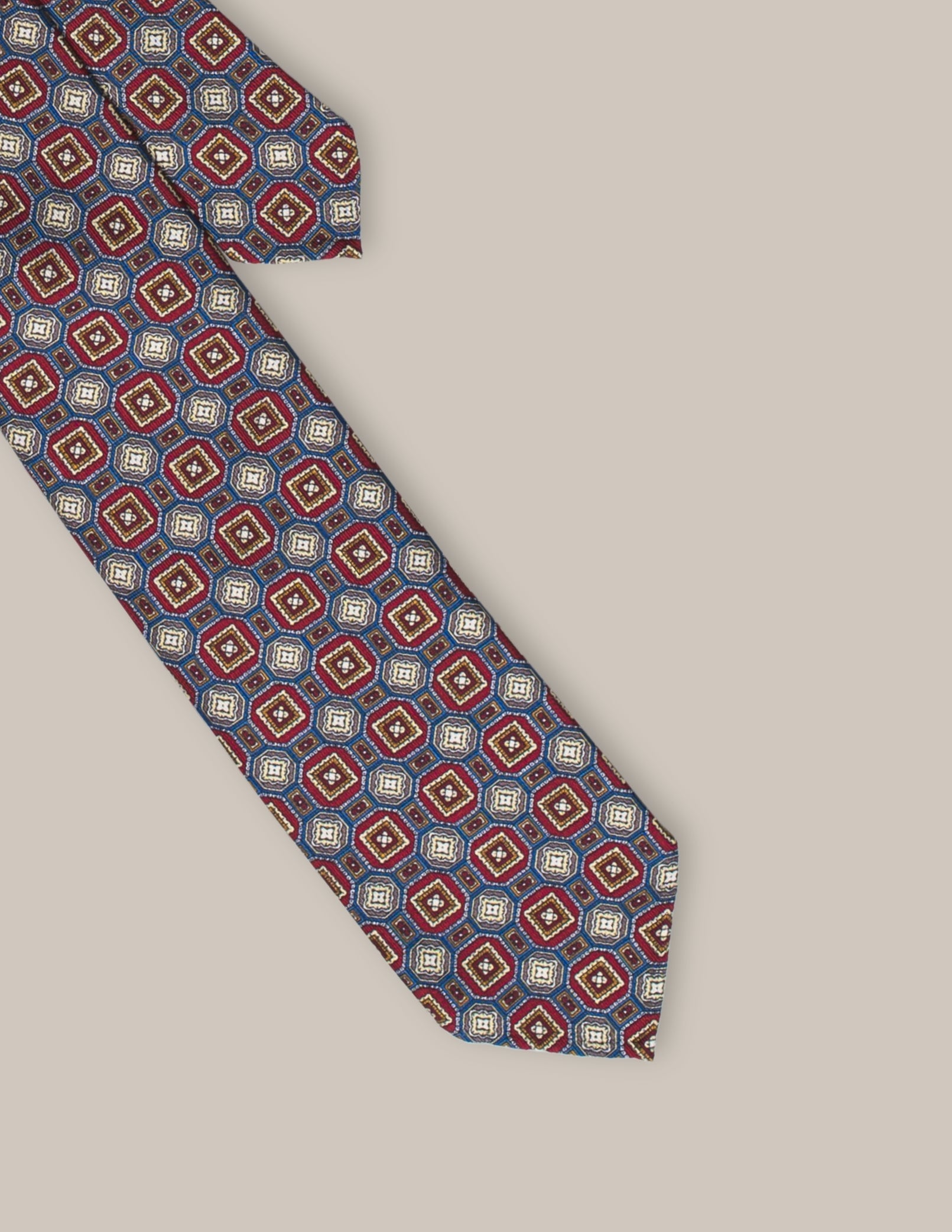 Krawat Rosso Geometrico to połączenie klasycznego designu z misternie wykonanym geometrycznym wzorem. Wykonany w całości z jedwabiu, uszyty w konstrukcji 3-fold, prezentuje głębokie burgundowe tło ozdobione heksagonalnymi detalami w odcieniach złota, błękitu i kremu. Ręcznie rolowane końcówki oraz brak podszewki podkreślają jego lekkość i ekskluzywny charakter, a klasyczny wełniano-bawełniany wkład zapewnia idealne ułożenie węzła.