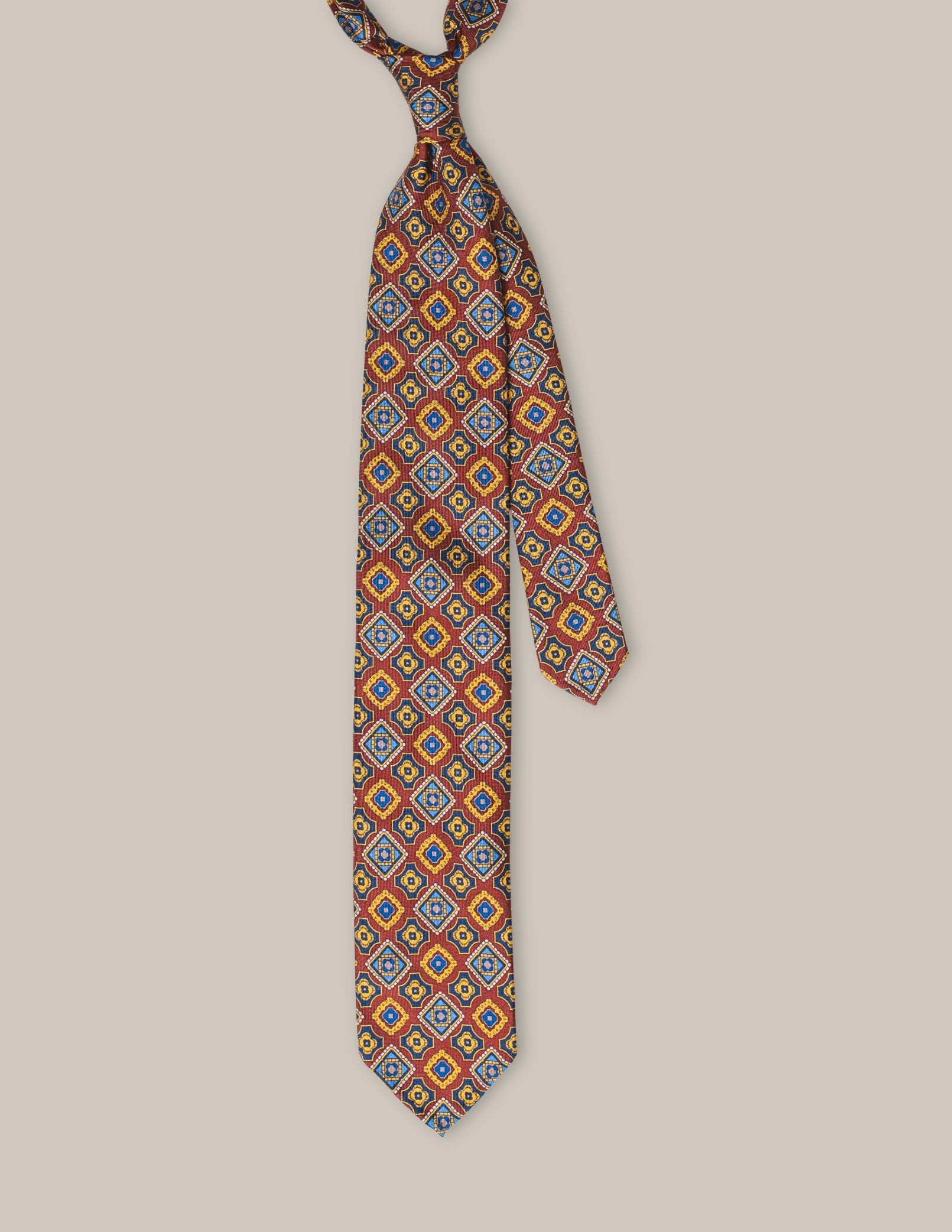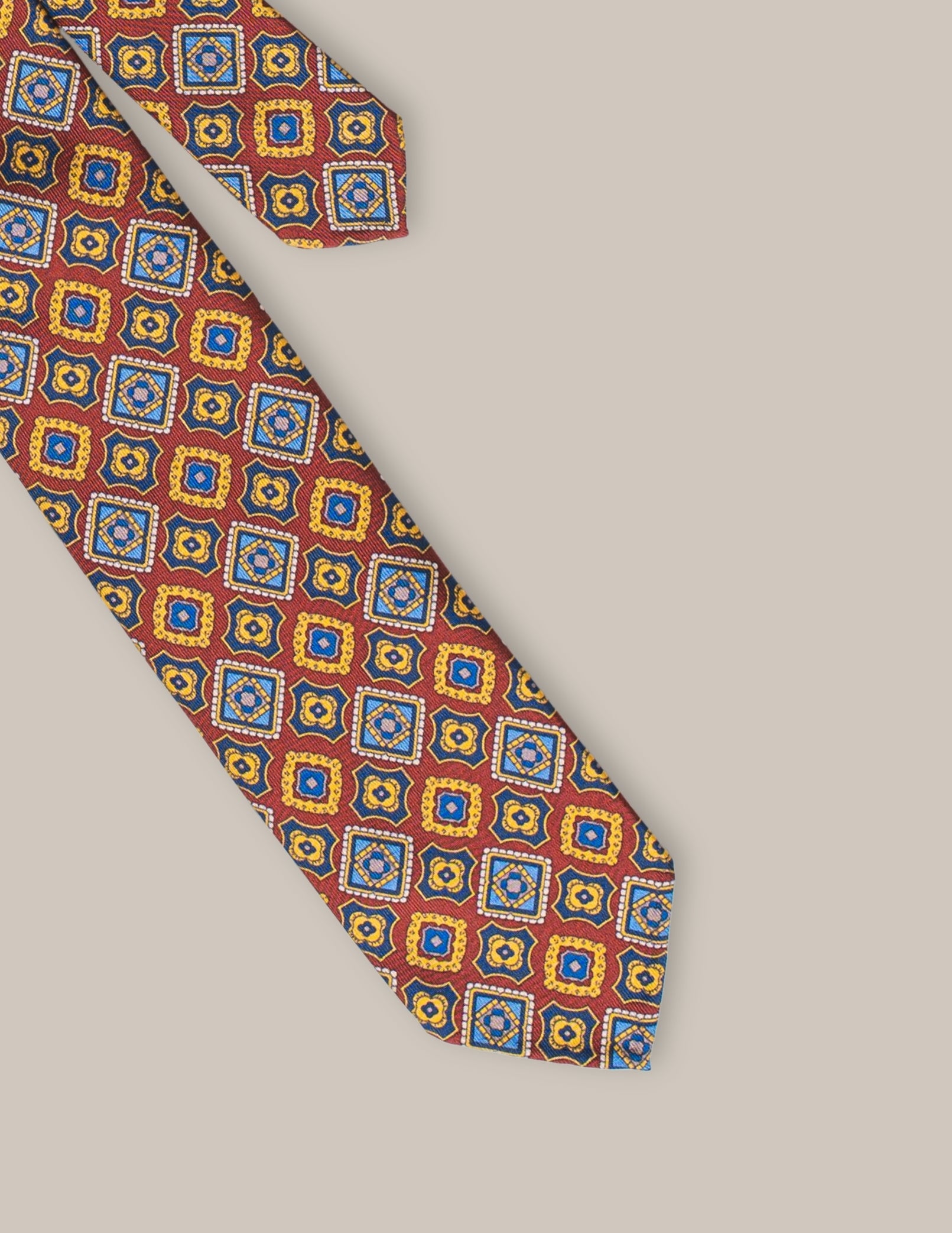 Krawat Rosso Ornato to wyjątkowy dodatek, który łączy w sobie klasyczny włoski styl z bogatym, geometrycznym wzorem. Wykonany w całości z jedwabiu, uszyty w konstrukcji 3-fold, prezentuje głębokie ceglaste tło ozdobione złoto-niebieskimi ornamentami o precyzyjnej symetrii. Ręcznie rolowane końcówki oraz brak podszewki podkreślają mistrzowskie wykonanie, a klasyczny wełniano-bawełniany wkład zapewnia doskonałe ułożenie węzła.