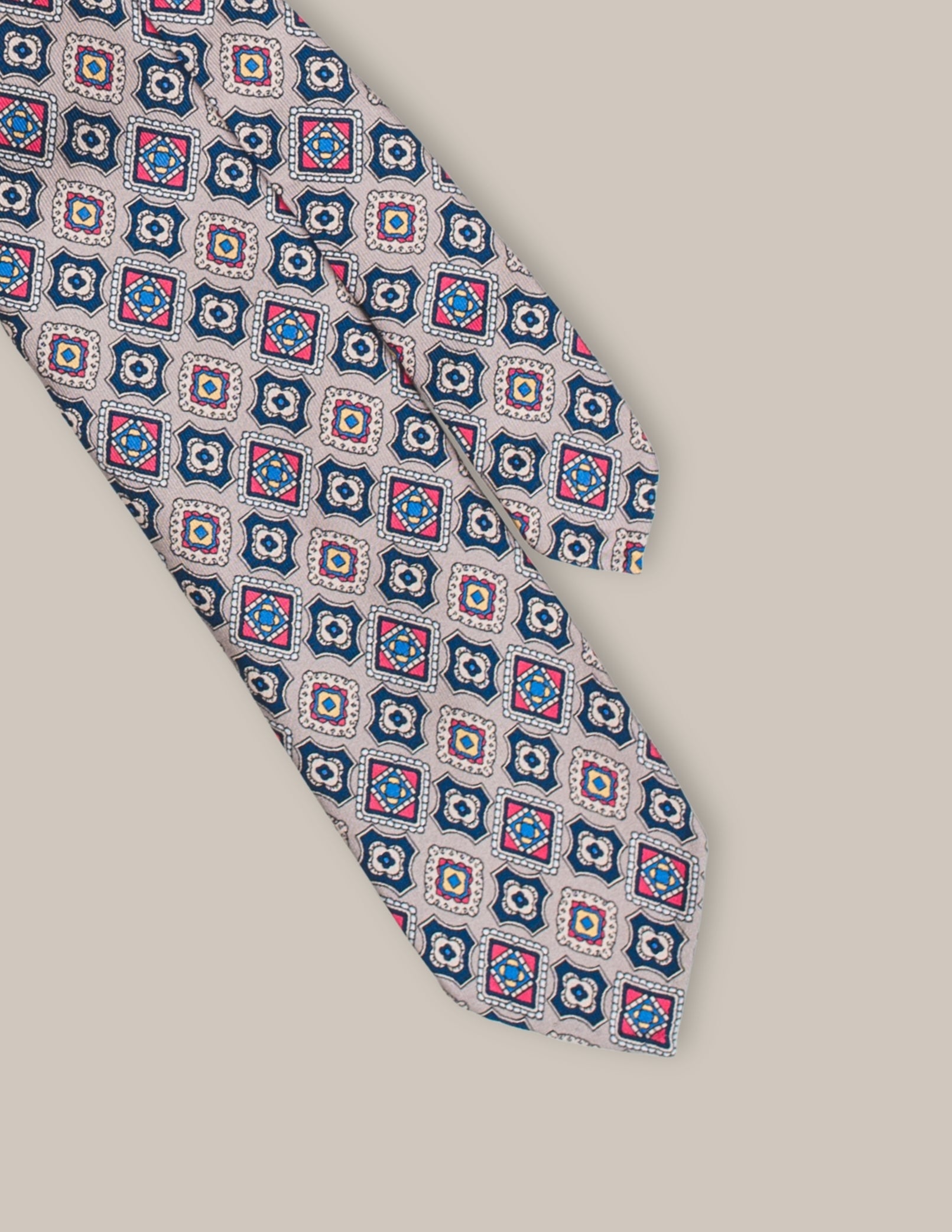 Krawat Sabbia Ornato to połączenie wyrafinowanego wzornictwa z delikatną, elegancką kolorystyką. Wykonany w całości z jedwabiu, uszyty w konstrukcji 3-fold, wyróżnia się subtelnym, piaskowym tłem ozdobionym misternymi ornamentami w odcieniach granatu, czerwieni i złota. Ręcznie rolowane końcówki oraz brak podszewki podkreślają lekkość krawata, a klasyczny wełniano-bawełniany wkład gwarantuje idealne ułożenie węzła.