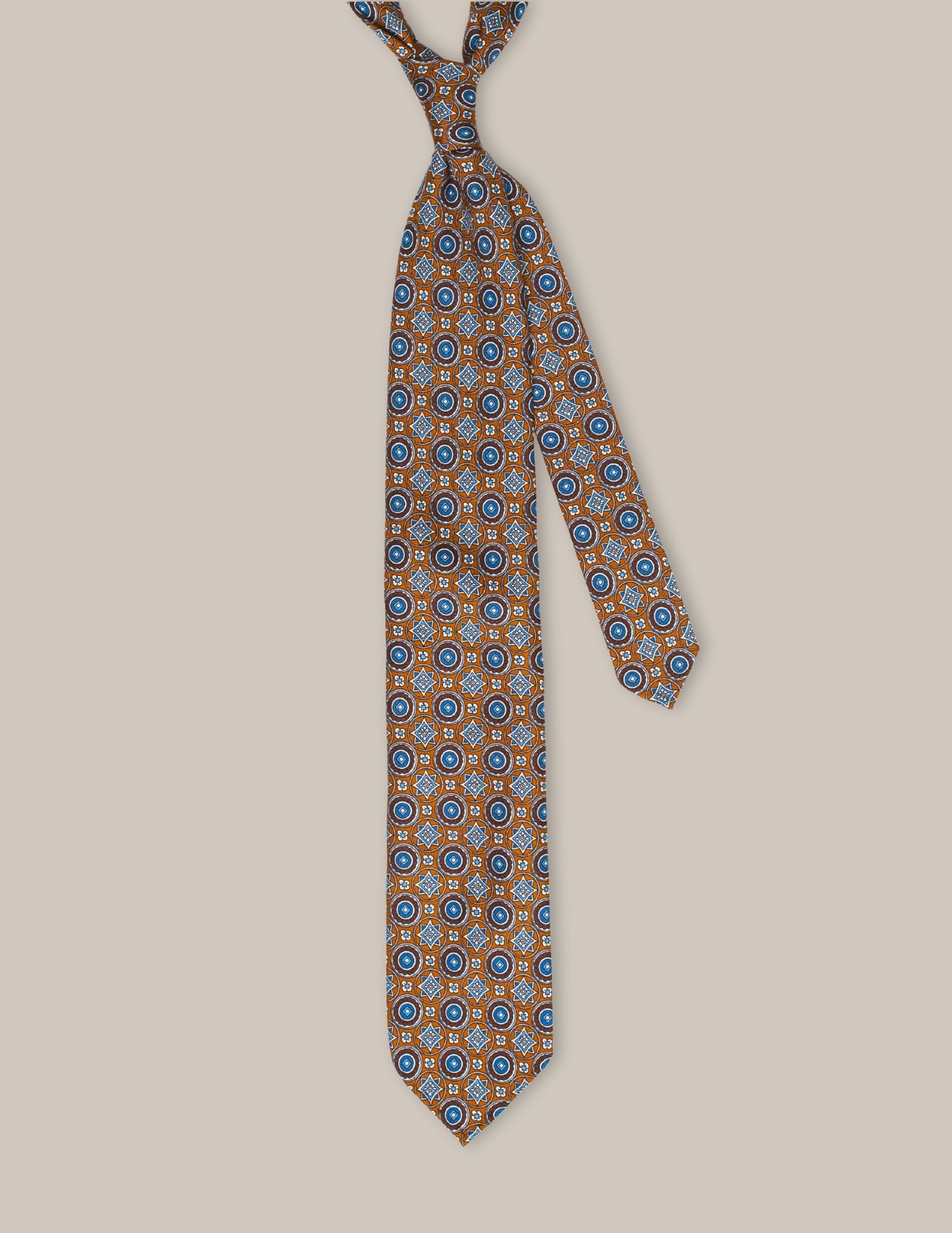 Krawat Terra Azzurra to harmonijne połączenie klasycznego stylu i wyrazistych detali. Wykonany w całości z jedwabiu, uszyty w konstrukcji 3-fold, zachwyca ciepłym odcieniem ziemistego brązu przełamanego geometrycznymi wzorami w odcieniach błękitu i bieli. Ręcznie rolowane końcówki i brak podszewki podkreślają jego lekkość, a klasyczny wełniano-bawełniany wkład zapewnia doskonałą strukturę i ułożenie.