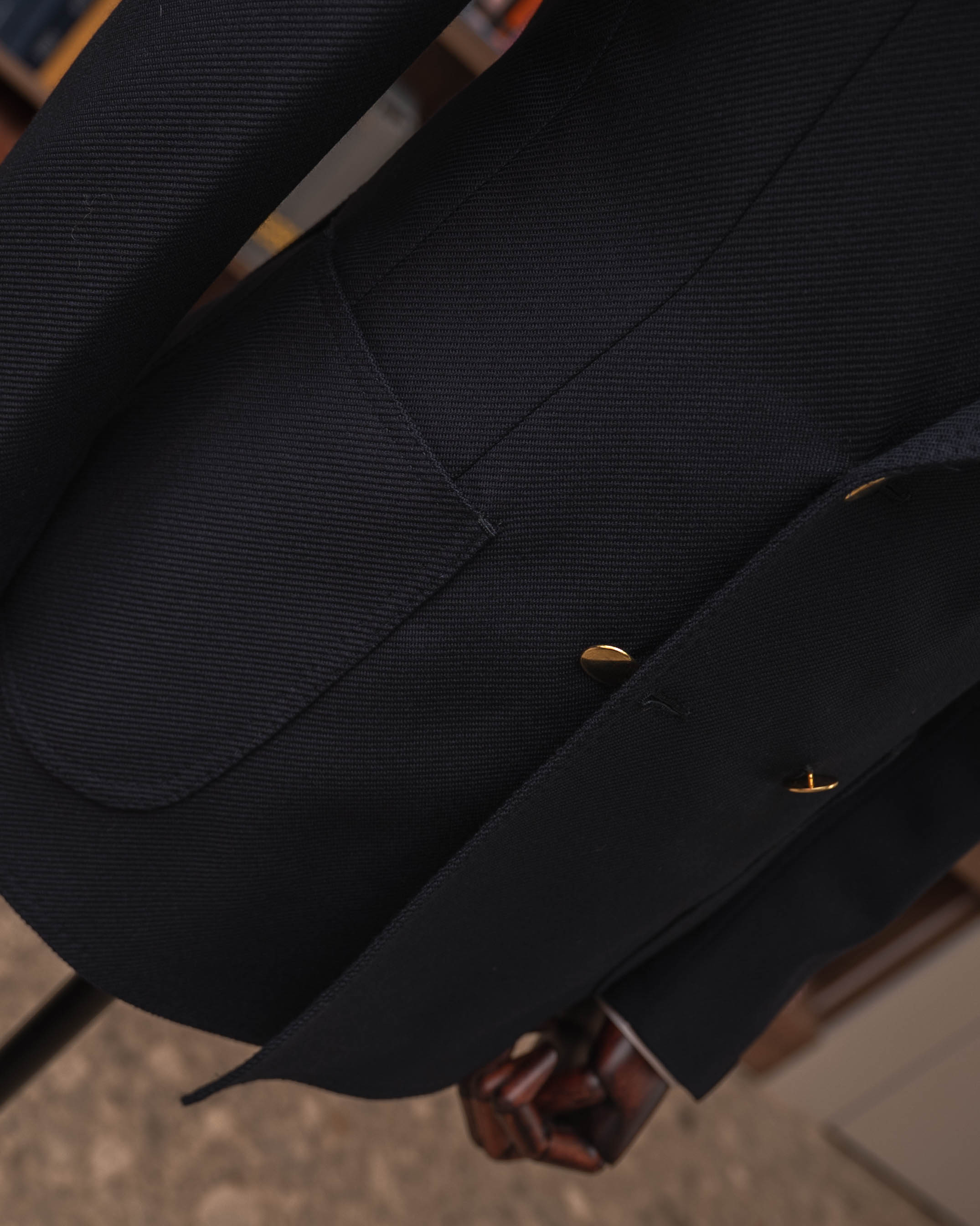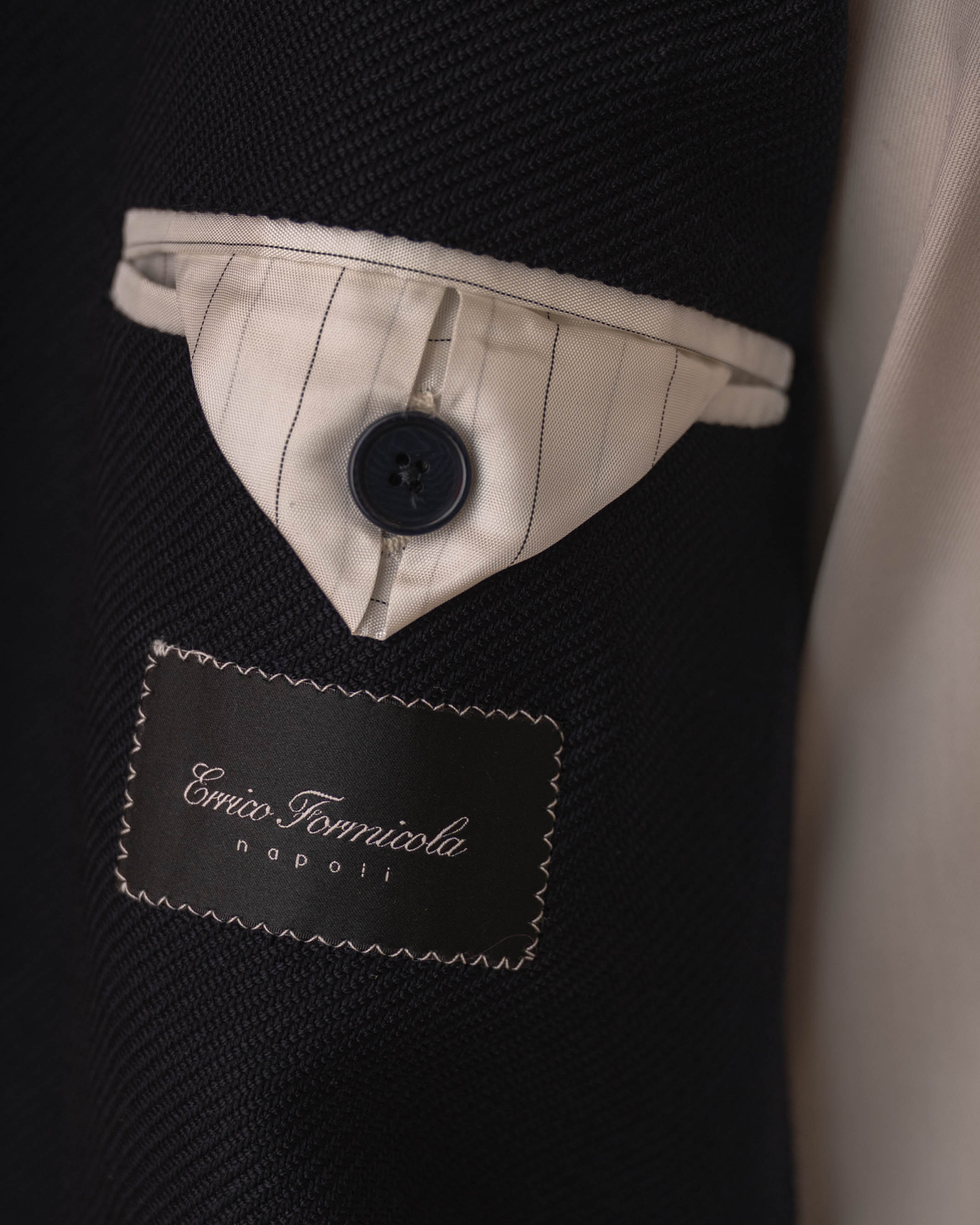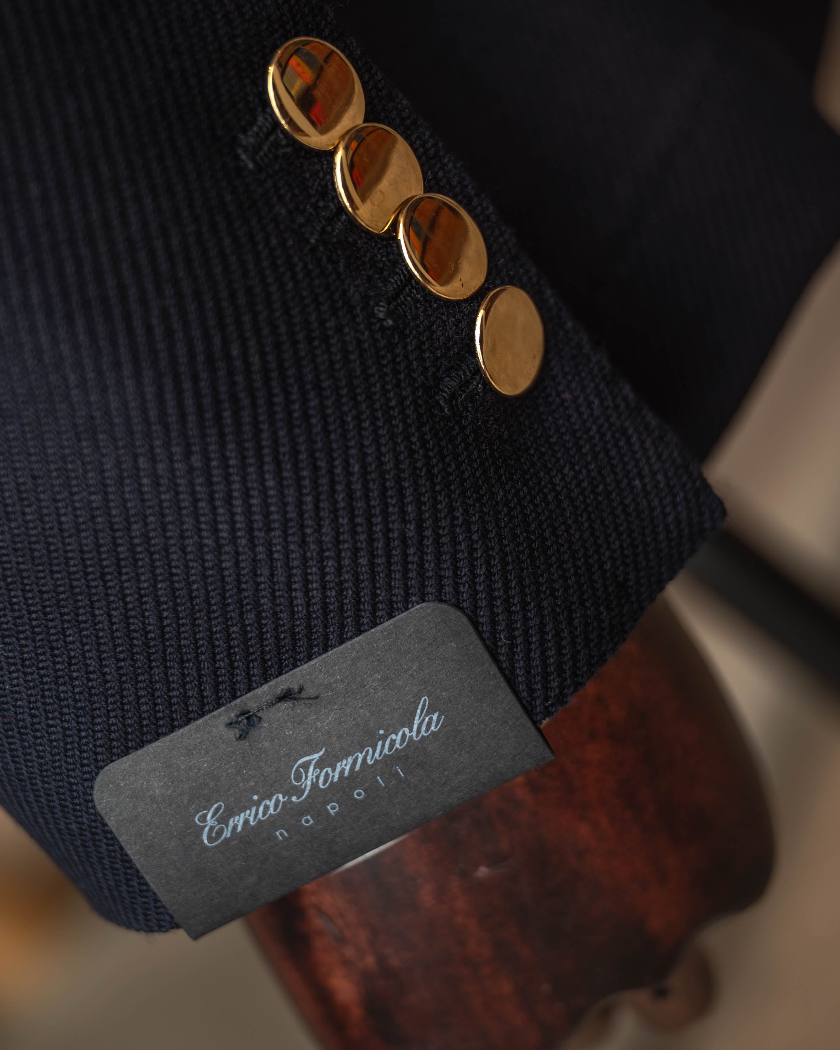 „Notte Partenopea” to kwintesencja neapolitańskiej elegancji: głęboki granat, dwurzędowy układ guzików 6x2 i złote, biżuteryjne guziki, które kojarzą się z wieczornymi światłami nad Zatoką Neapolitańską. Marynarka jest całkowicie niekonstrukcyjna – bez płótna, bez klejonki, bez wkładów barkowych – dzięki czemu nosi się ją jak wygodny cardigan, a nie „zbroję”. Miękkie, neapolitańskie ramiona, ostre klapy z pięknym rolowaniem i naszywane kieszenie sprawiają, że zestawisz ją zarówno z szarą flanelą, jak i z kremowymi spodniami z bawełny. Ręcznie obszywane dziurki i starannie przyszyte guziki przypominają, że to wciąż prawdziwe rzemiosło, nie produkt taśmy. Manufaktura E. Formicola od lat 60. działa w sercu Neapolu, szyjąc krótkie serie marynarek w duchu lokalnej tradycji krawieckiej.