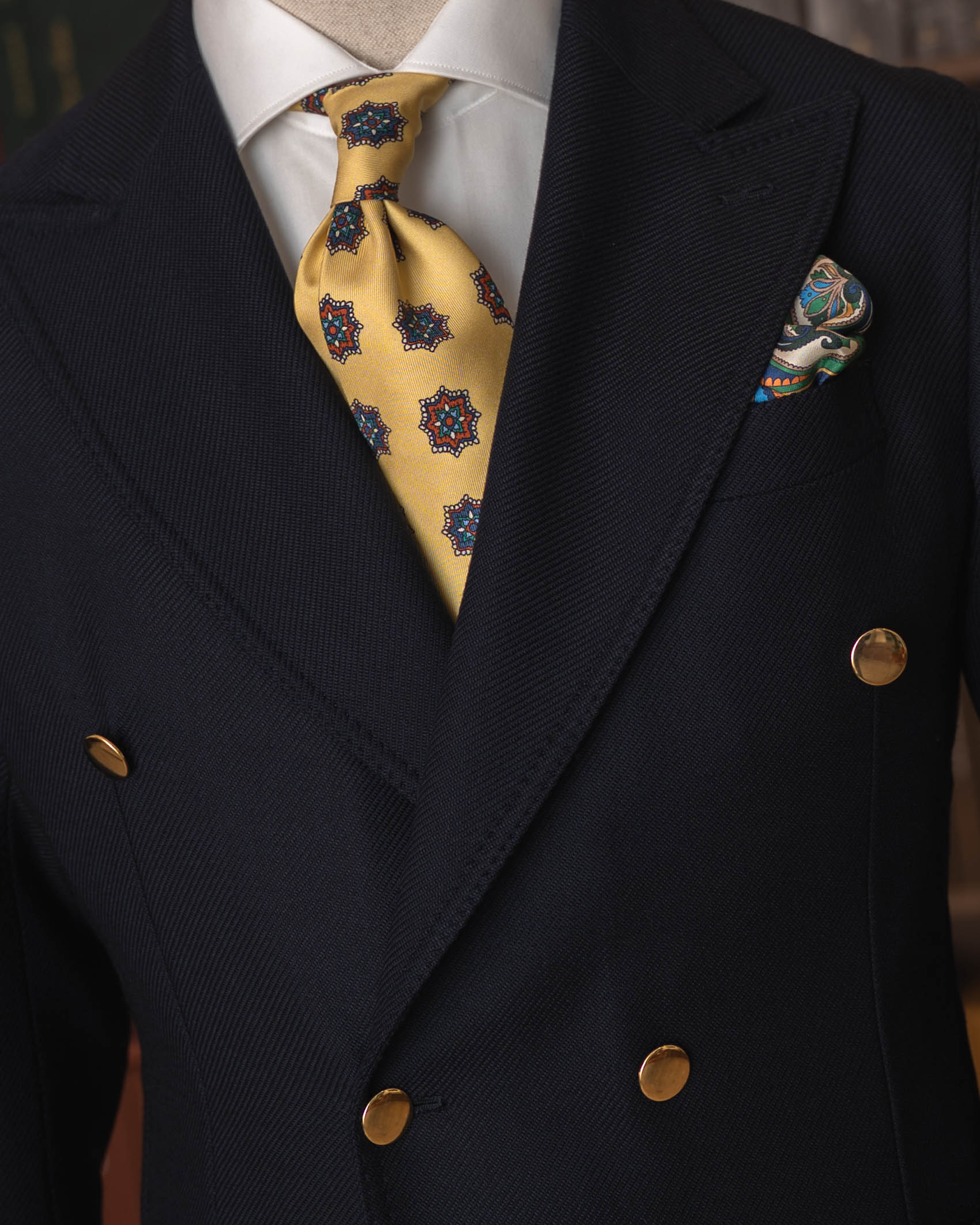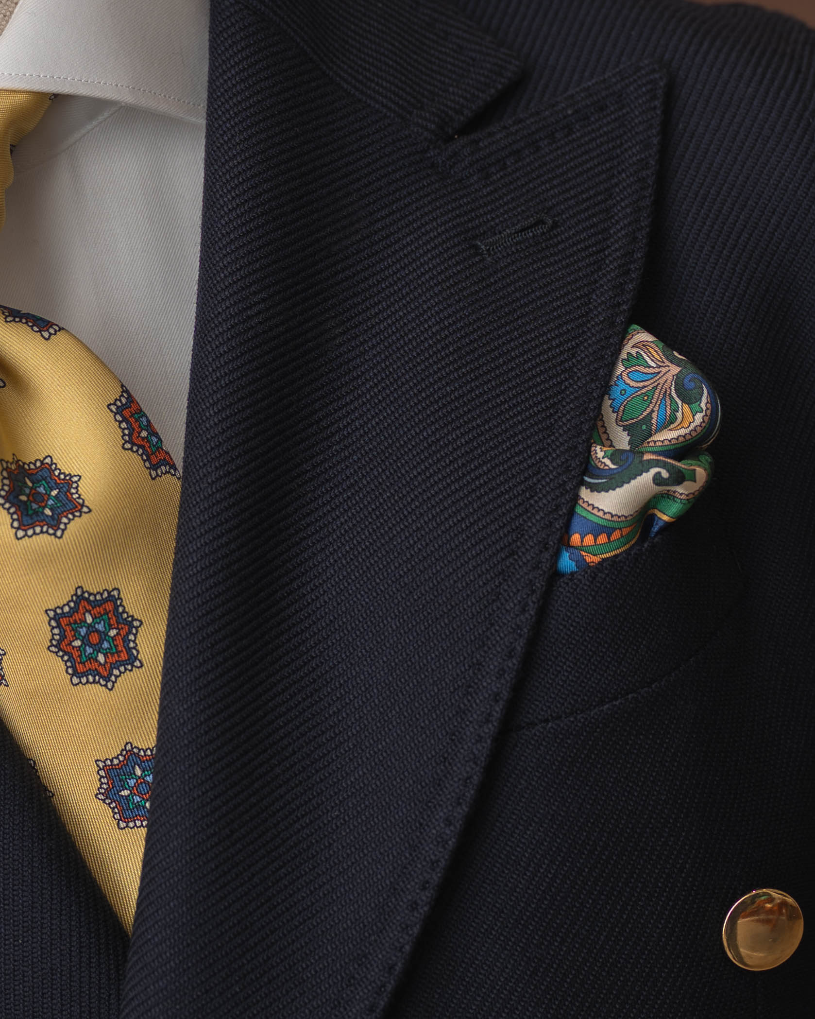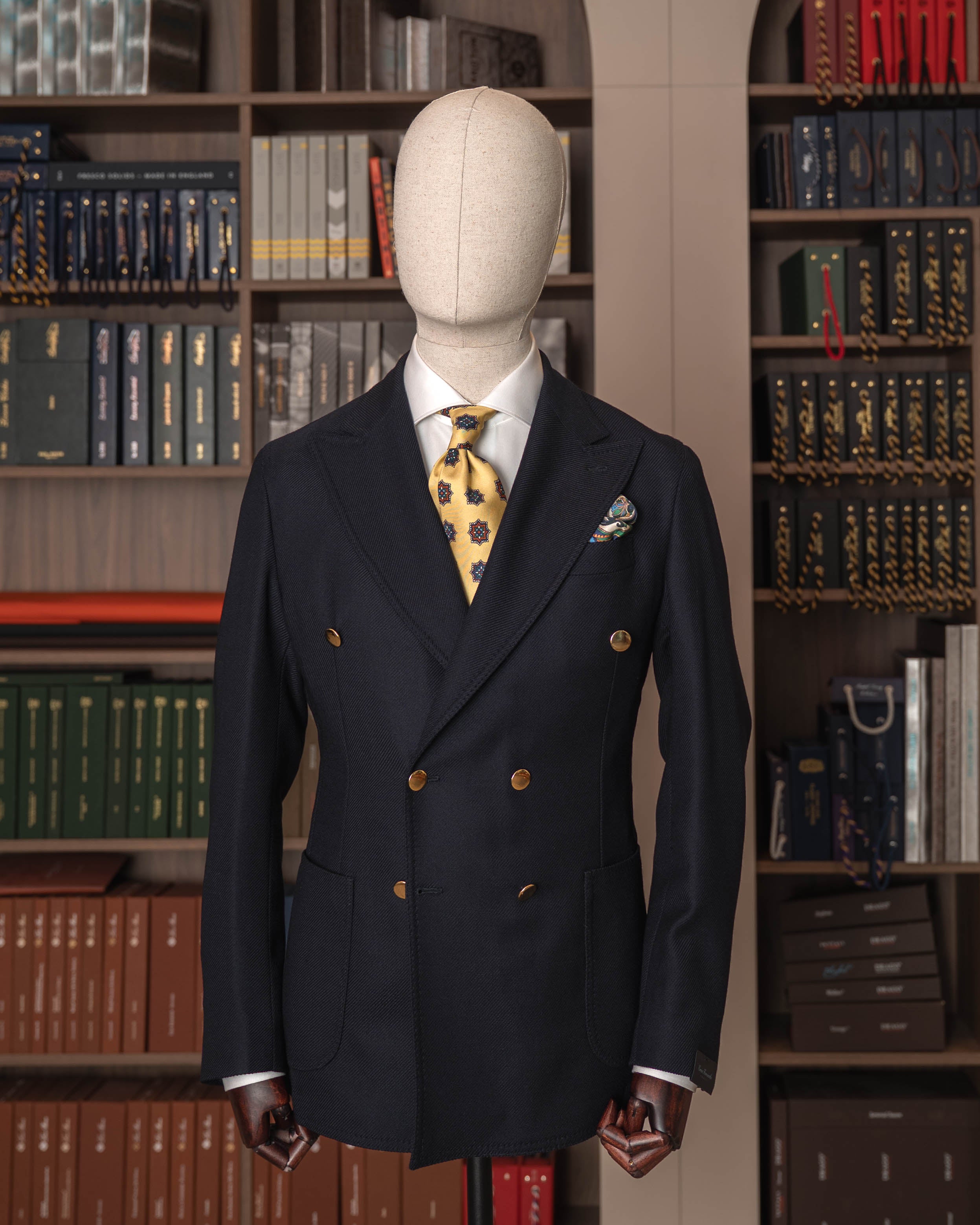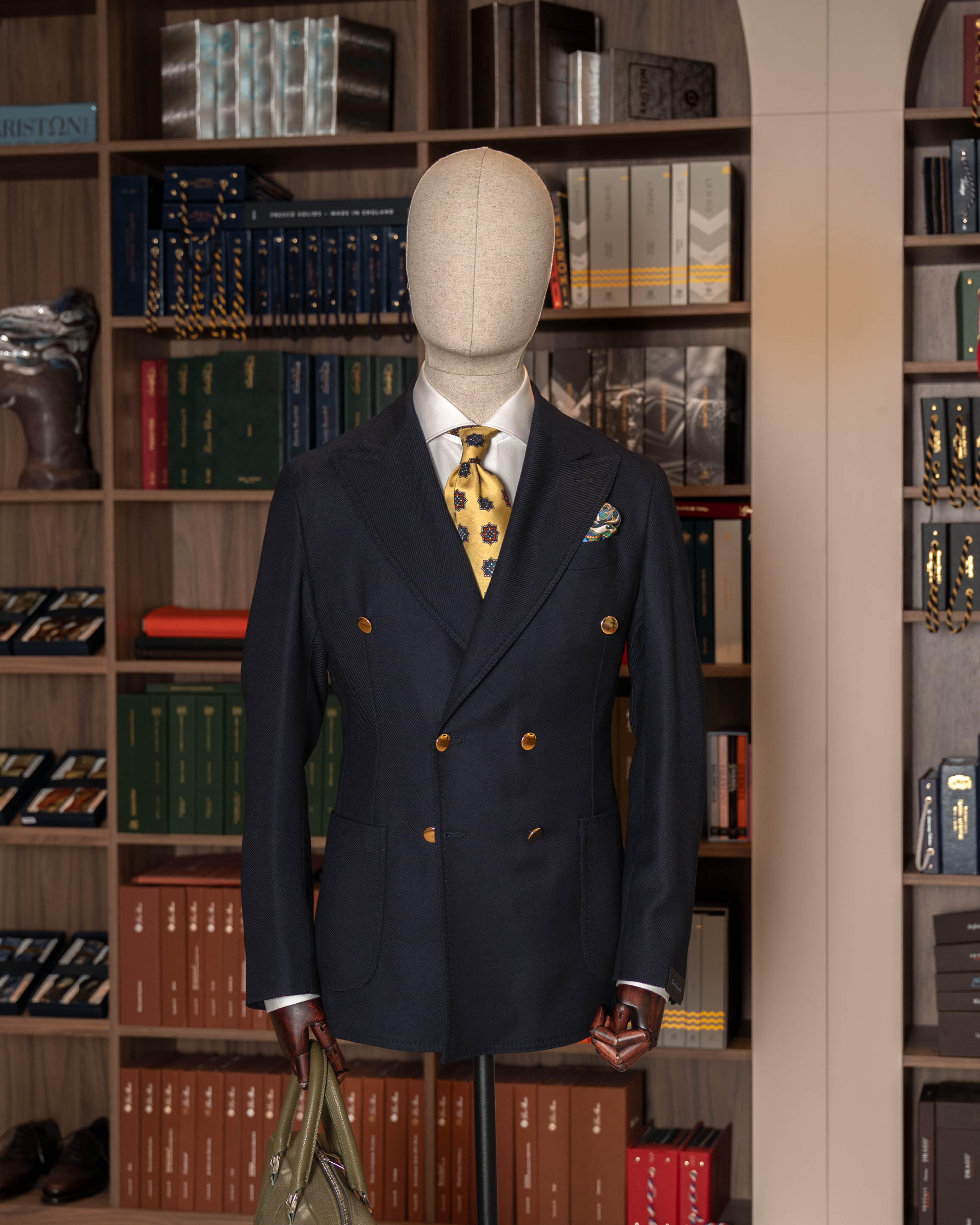 „Notte Partenopea” to kwintesencja neapolitańskiej elegancji: głęboki granat, dwurzędowy układ guzików 6x2 i złote, biżuteryjne guziki, które kojarzą się z wieczornymi światłami nad Zatoką Neapolitańską. Marynarka jest całkowicie niekonstrukcyjna – bez płótna, bez klejonki, bez wkładów barkowych – dzięki czemu nosi się ją jak wygodny cardigan, a nie „zbroję”. Miękkie, neapolitańskie ramiona, ostre klapy z pięknym rolowaniem i naszywane kieszenie sprawiają, że zestawisz ją zarówno z szarą flanelą, jak i z kremowymi spodniami z bawełny. Ręcznie obszywane dziurki i starannie przyszyte guziki przypominają, że to wciąż prawdziwe rzemiosło, nie produkt taśmy. Manufaktura E. Formicola od lat 60. działa w sercu Neapolu, szyjąc krótkie serie marynarek w duchu lokalnej tradycji krawieckiej.
