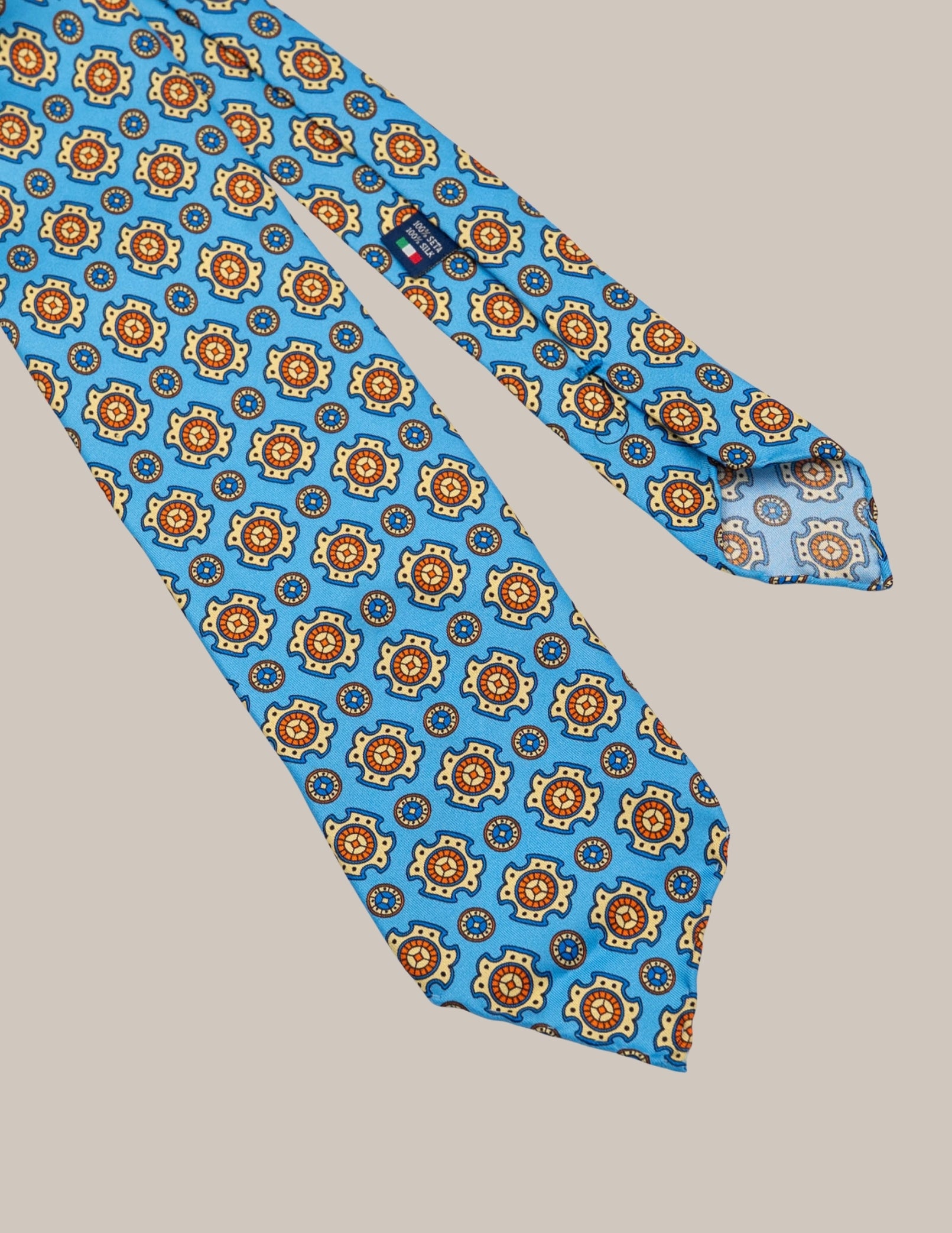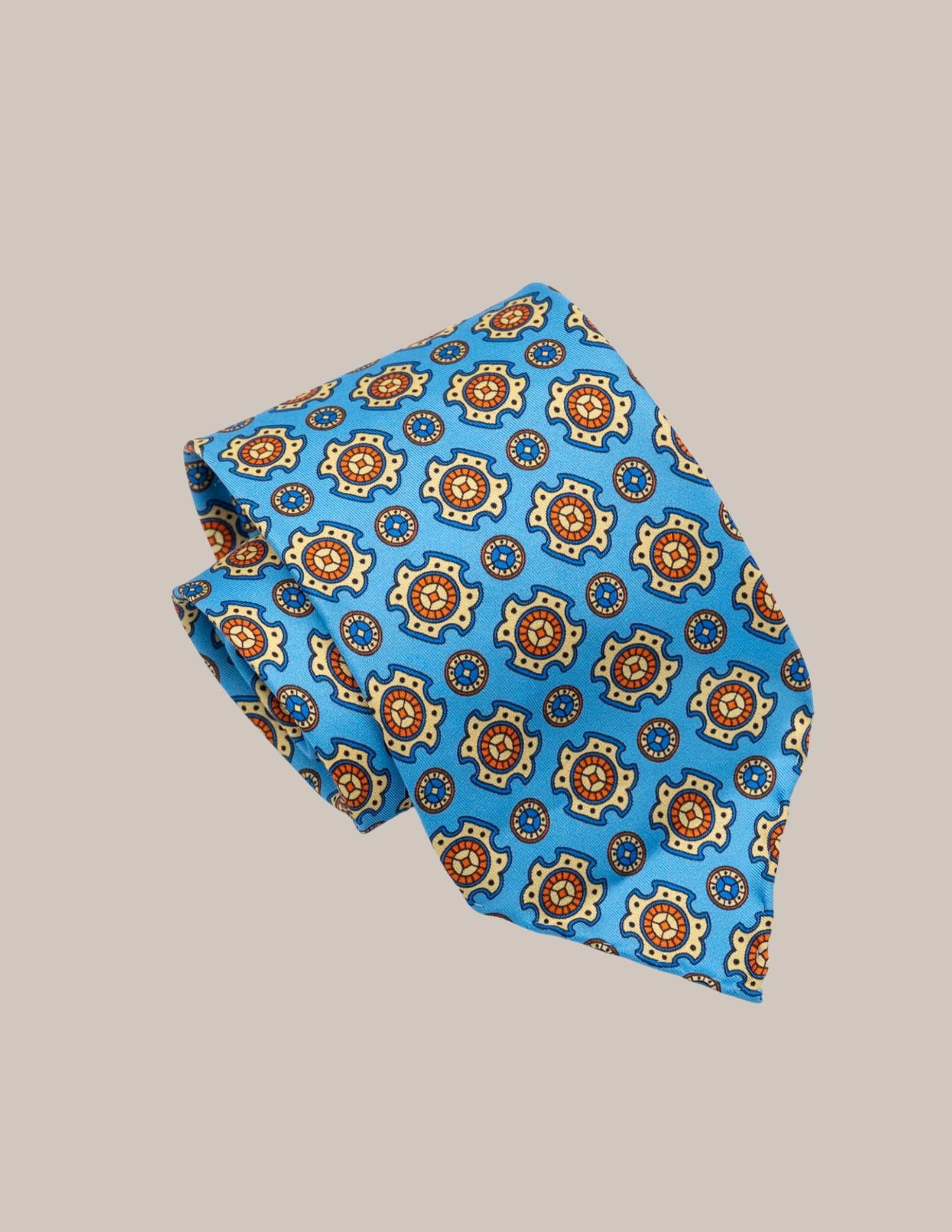 Jasnoniebieskie tło krawata zdobi powtarzający się wzór medalionów przypominających stylizowane stery okrętowe – w ciepłych odcieniach żółci, pomarańczu i akcentach granatu. Ten wyrazisty, a jednocześnie harmonijny deseń przywołuje klimat letnich kurortów nad Ligurią i świetnie sprawdzi się zarówno do granatowego garnituru, jak i beżowej marynarki z lnem czy bawełną. Idealny wybór, gdy chcesz dodać energii klasycznemu zestawowi z białą lub błękitną koszulą.
