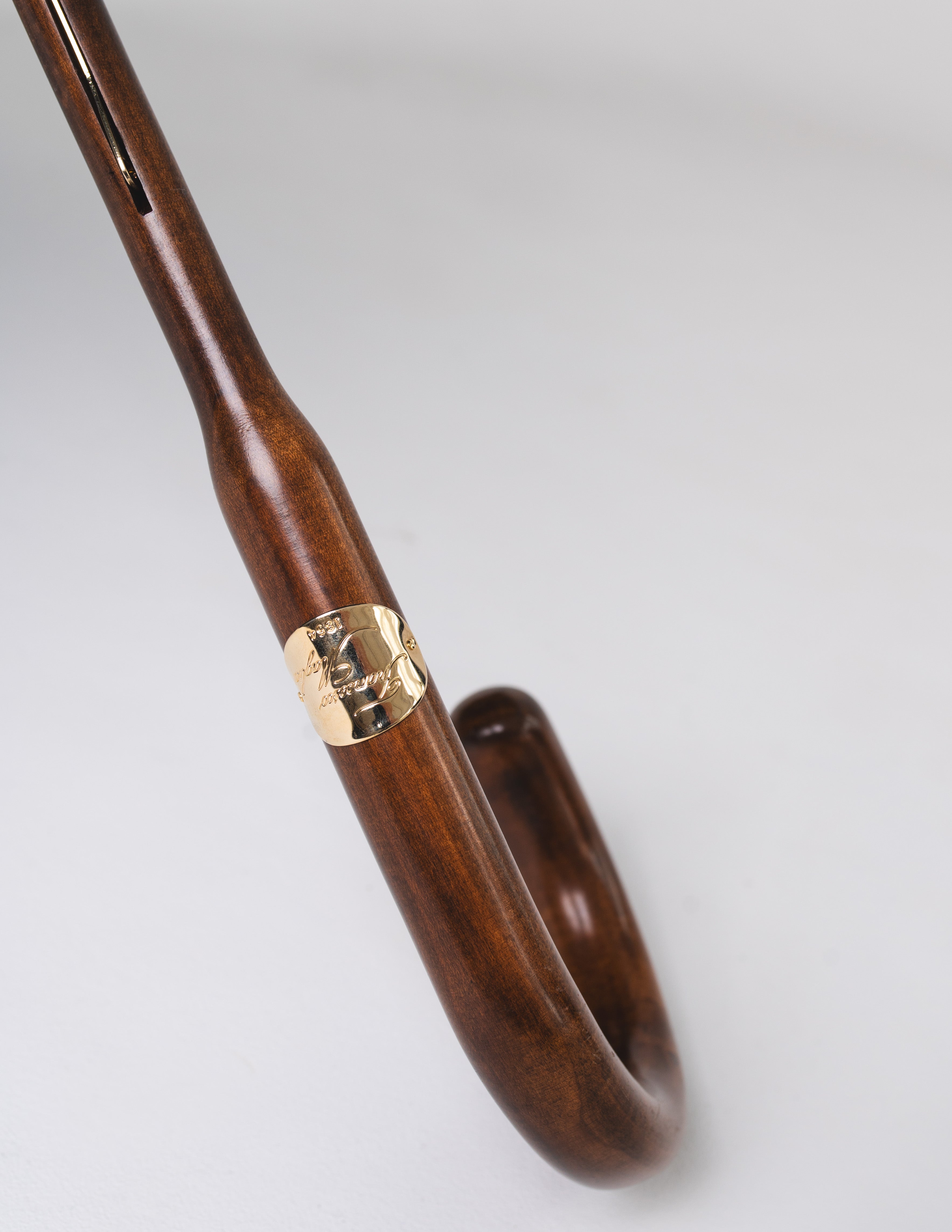 Ten parasol to kwintesencja włoskiej elegancji i precyzji rzemieślniczej. Rączka wykonana z ciemnego drewna klonowego zachwyca gładką linią i szlachetnym odcieniem, podkreślając jego naturalne piękno. Czasza w głębokiej zieleni ozdobiona subtelną granatową pepitką, uszyta z luksusowej tkaniny z Como, dodaje mu klasycznego uroku i przyciąga spojrzenia swoim nietuzinkowym wzorem.