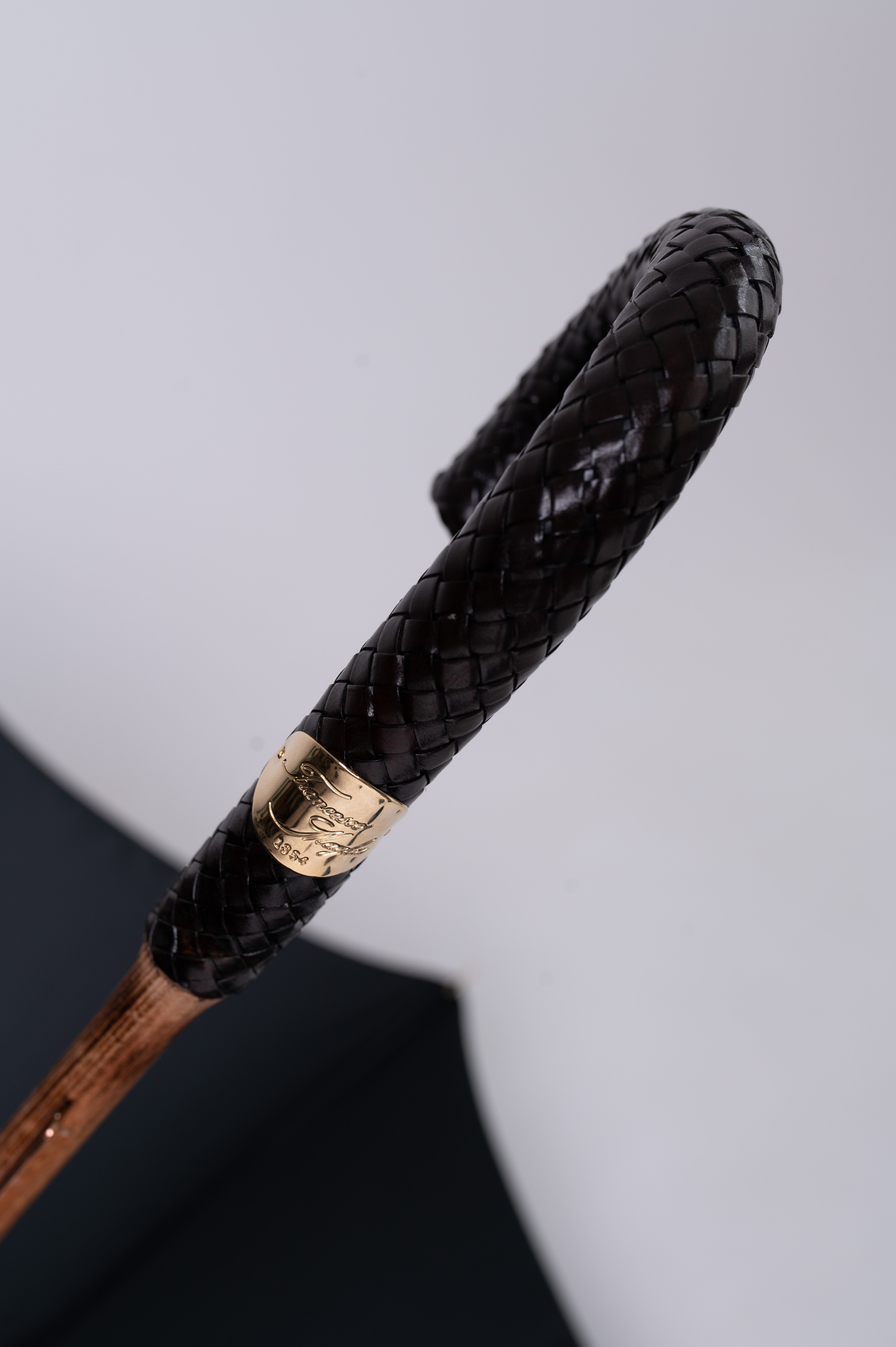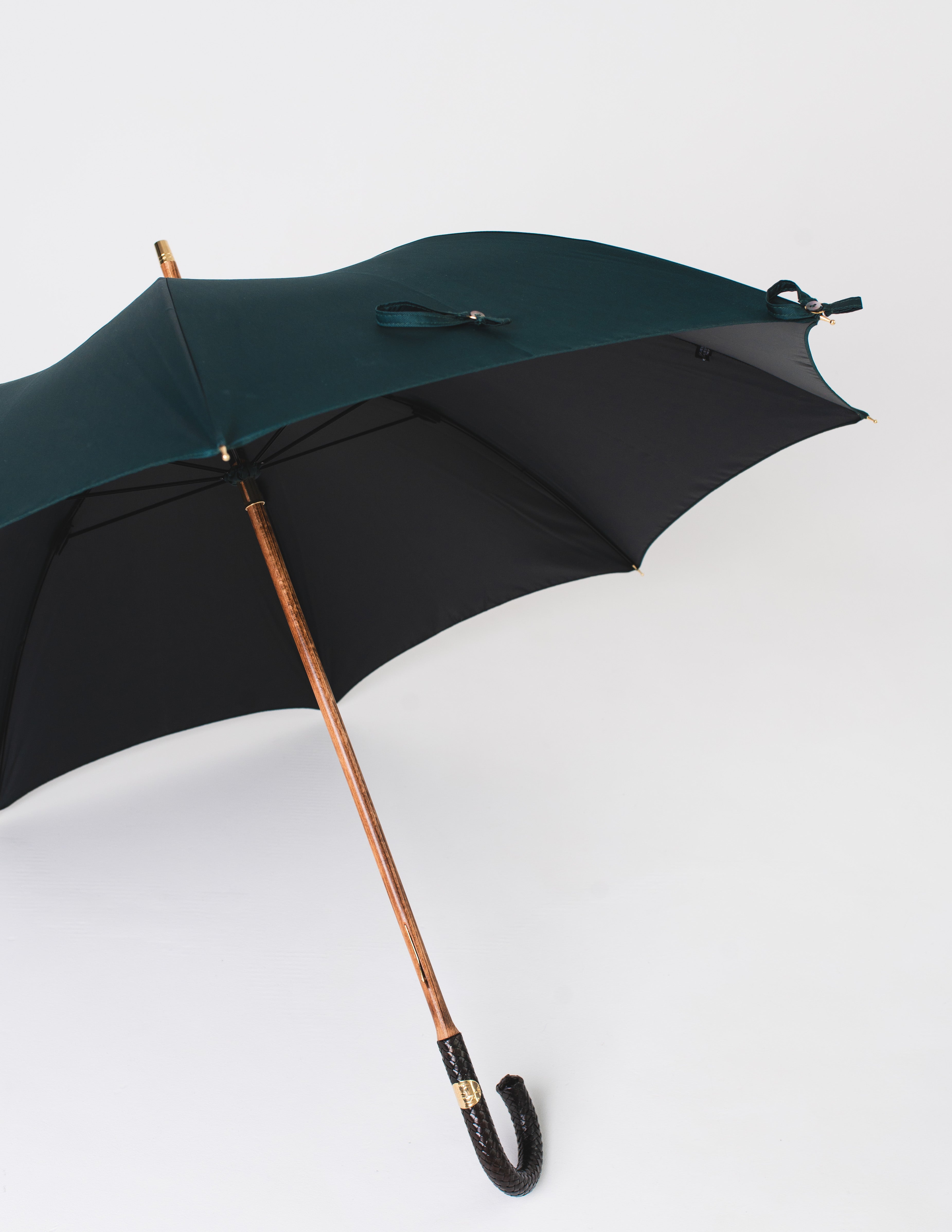 Ten parasol to doskonałe połączenie klasycznej elegancji i mistrzowskiego rzemiosła. Rączka wykonana z drewna bukowego, starannie pokrytego miękką, naturalną skórą, zachwyca wyjątkowym wykończeniem, które zapewnia nie tylko komfort, ale i luksusowy charakter. Czasza w głębokim, butelkowozielonym kolorze, uszyta z tkaniny pochodzącej z Como, emanuje ponadczasową elegancją i subtelnym urokiem.
