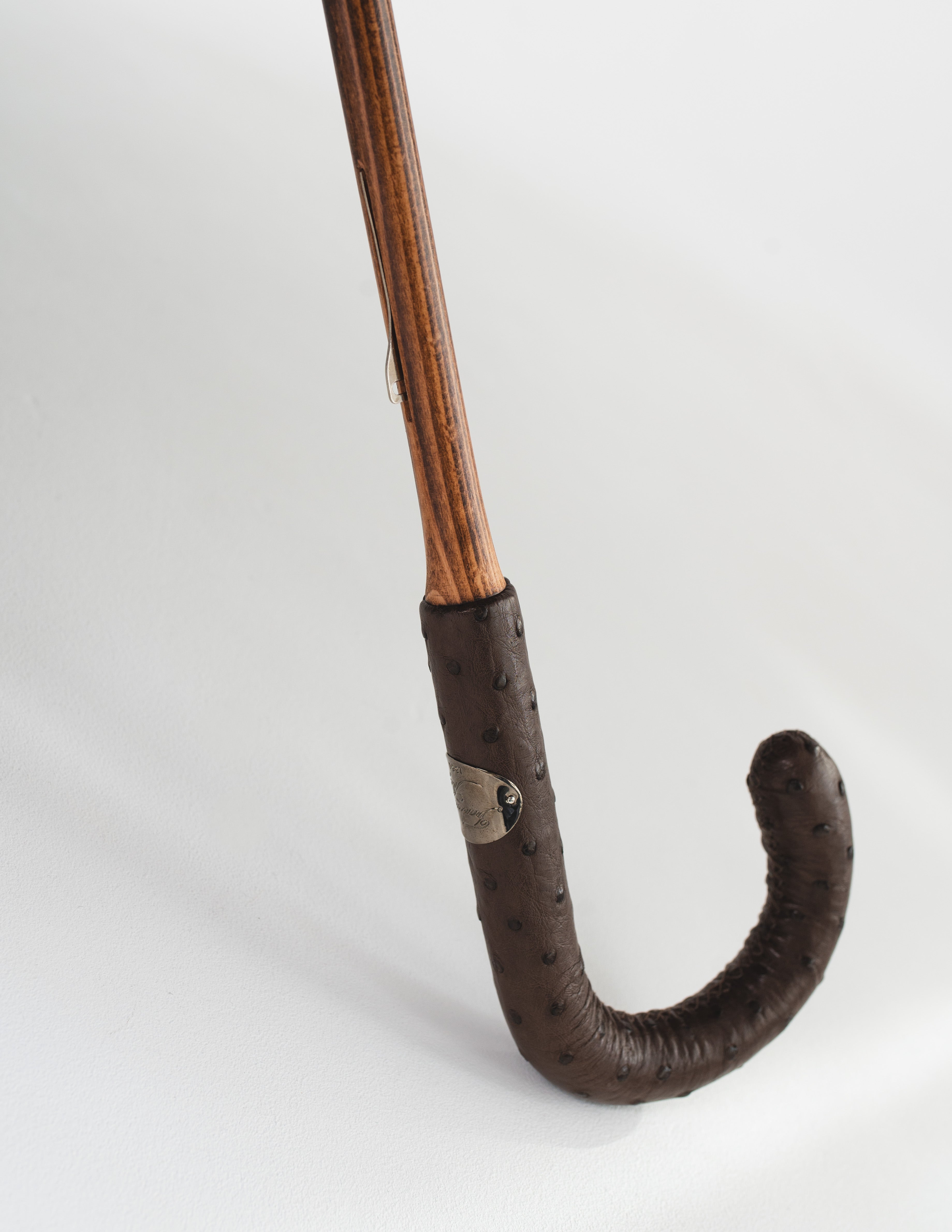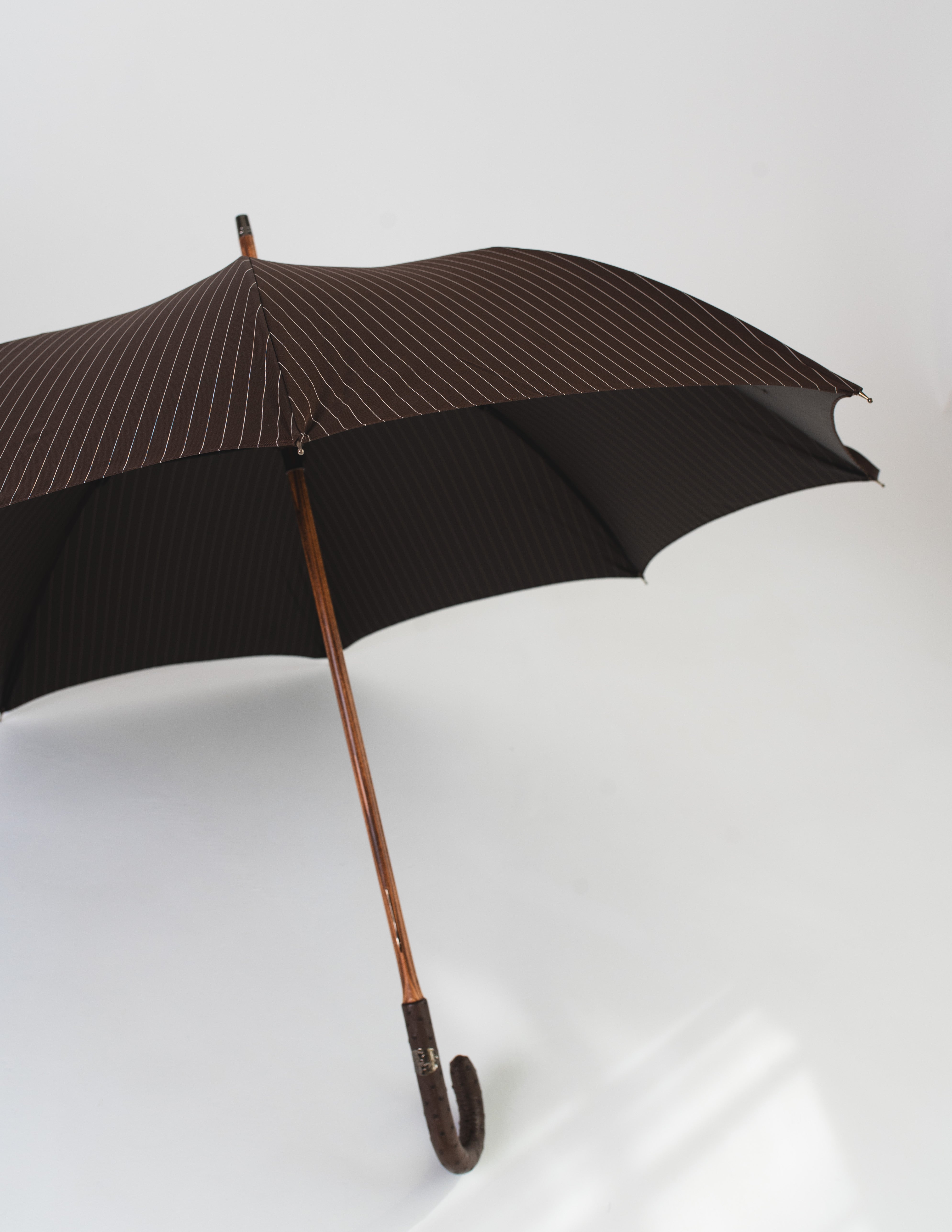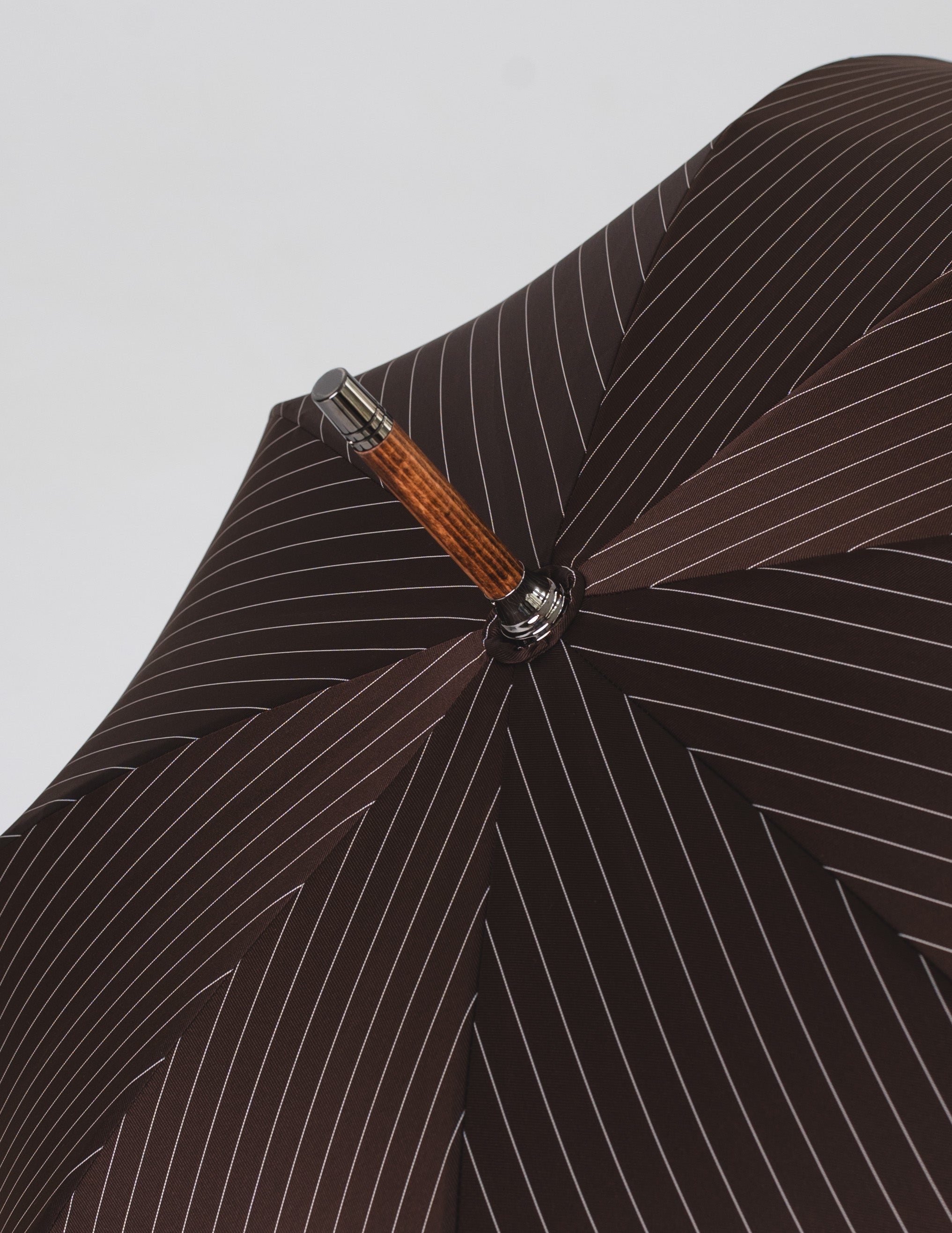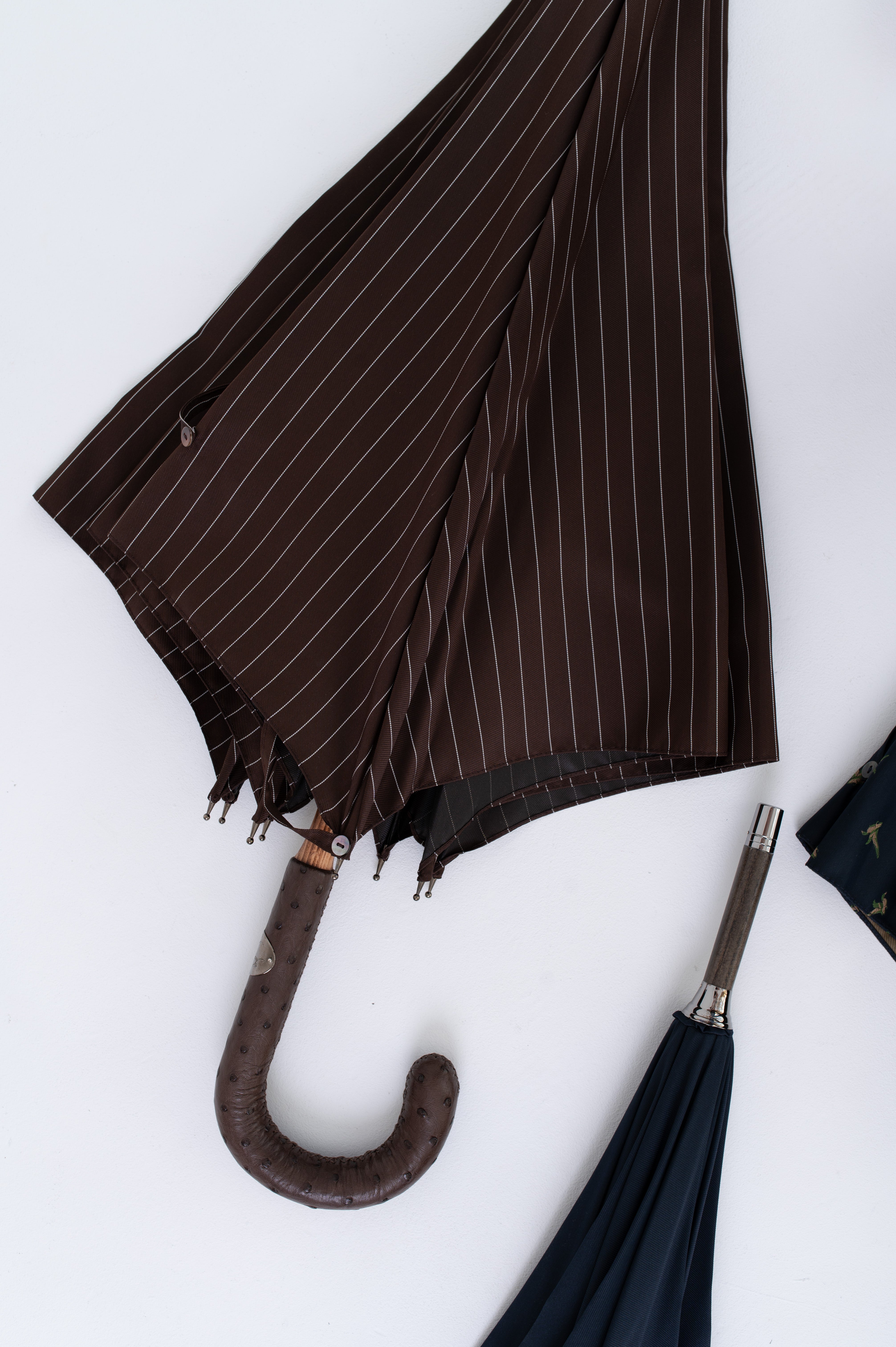 Parasol Francesco Maglia z rączką z drewna bukowego pokrytego skórą strusia i czaszą w brązowy delikatny prążek