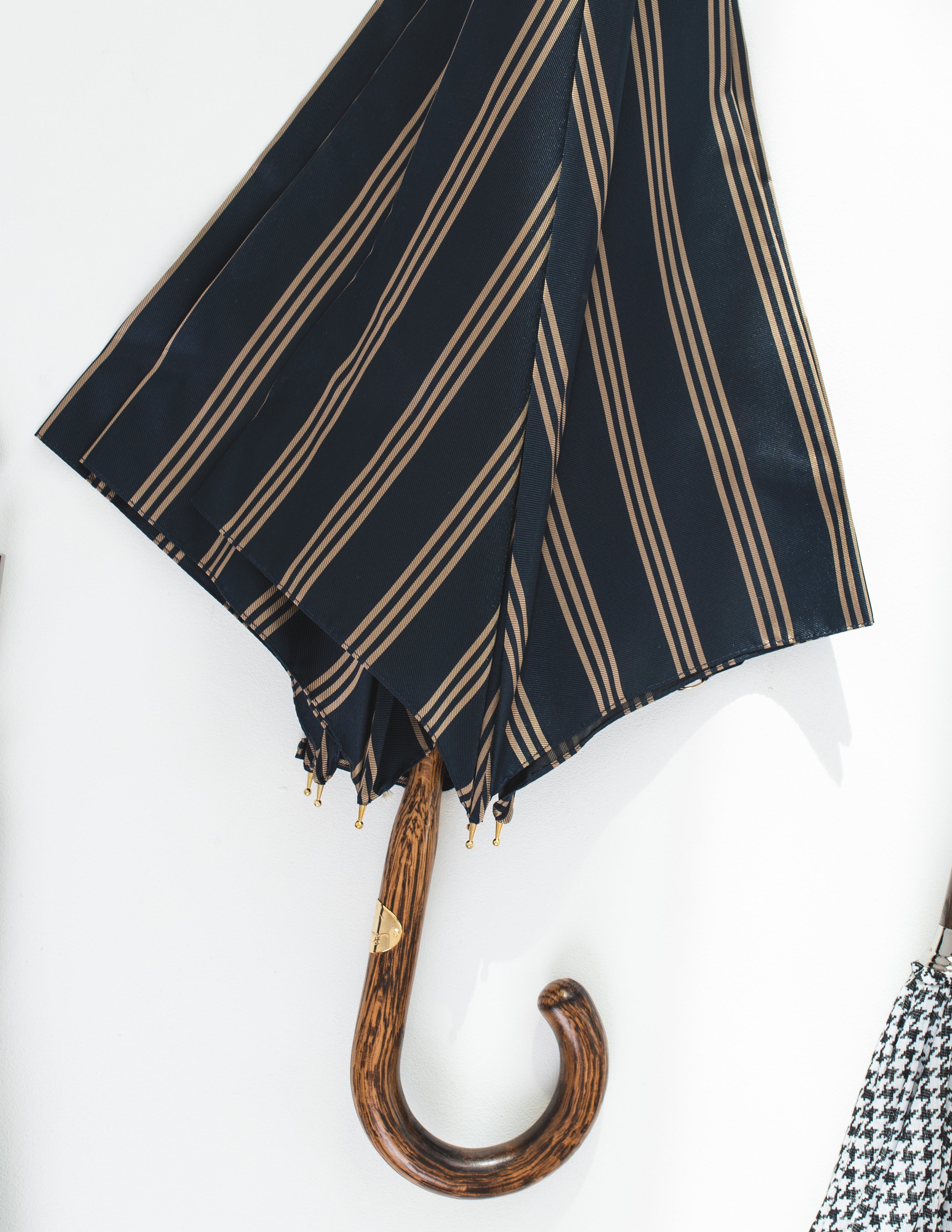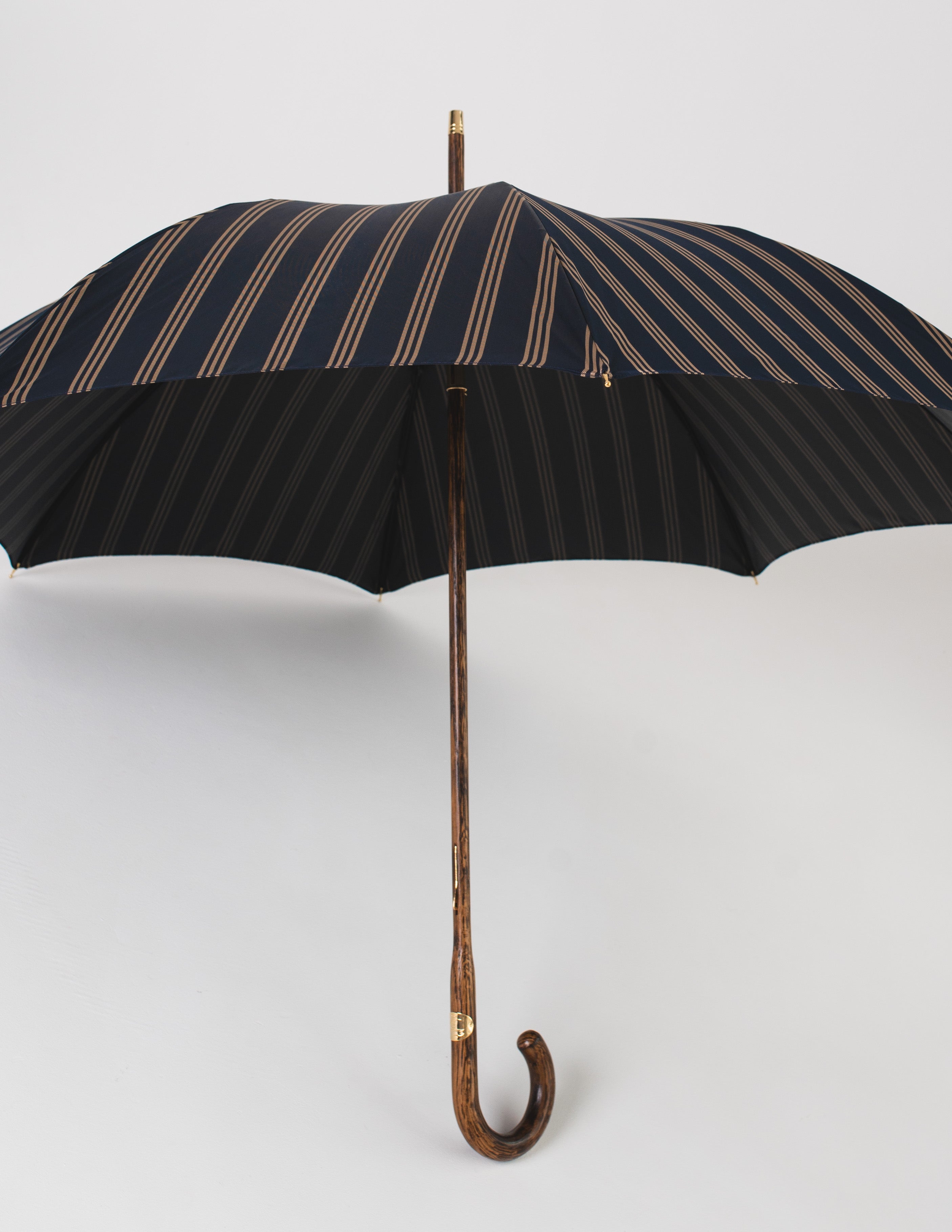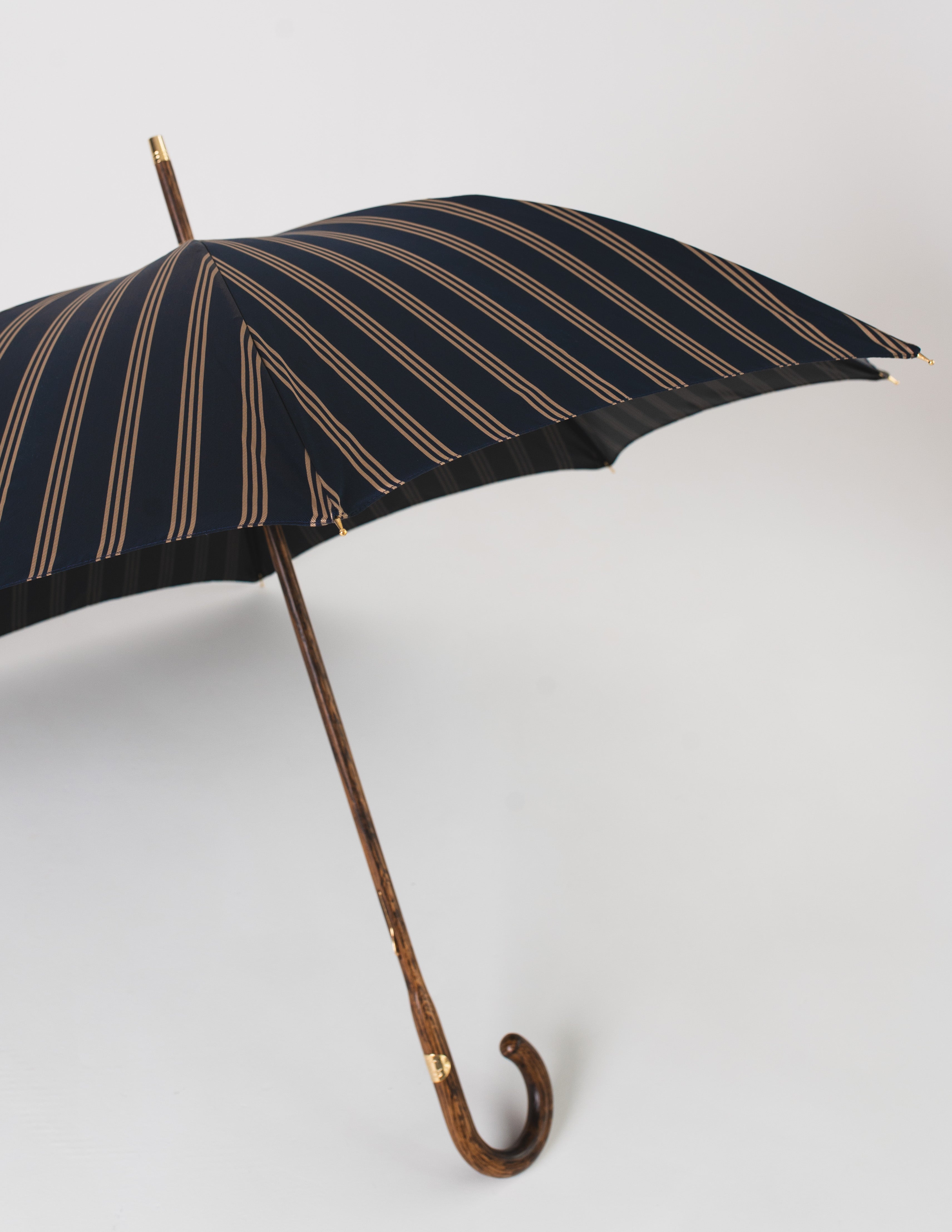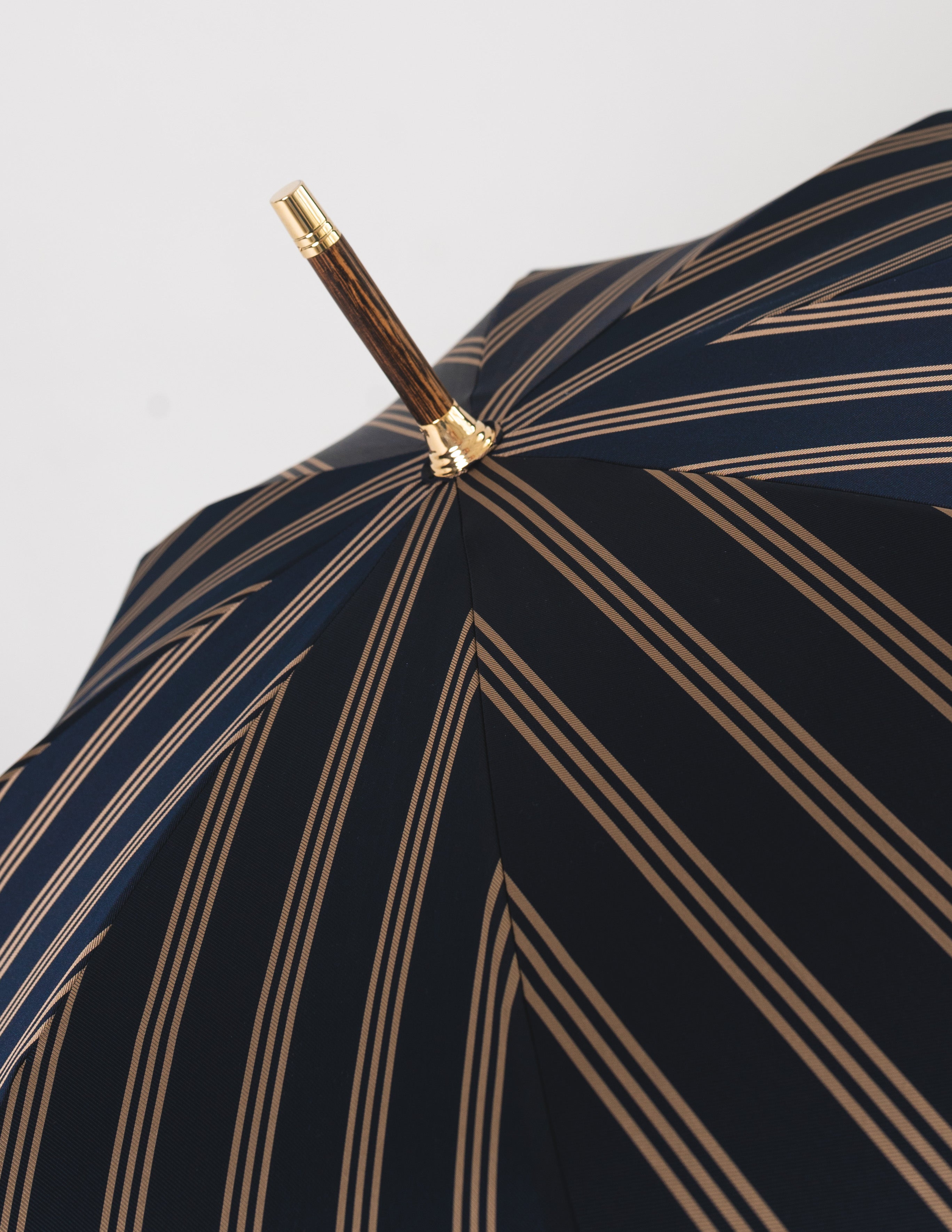 Parasol Francesco Maglia z rączką z płomienistego drewna bukowego i czaszą w granatowo-beżowe prążki