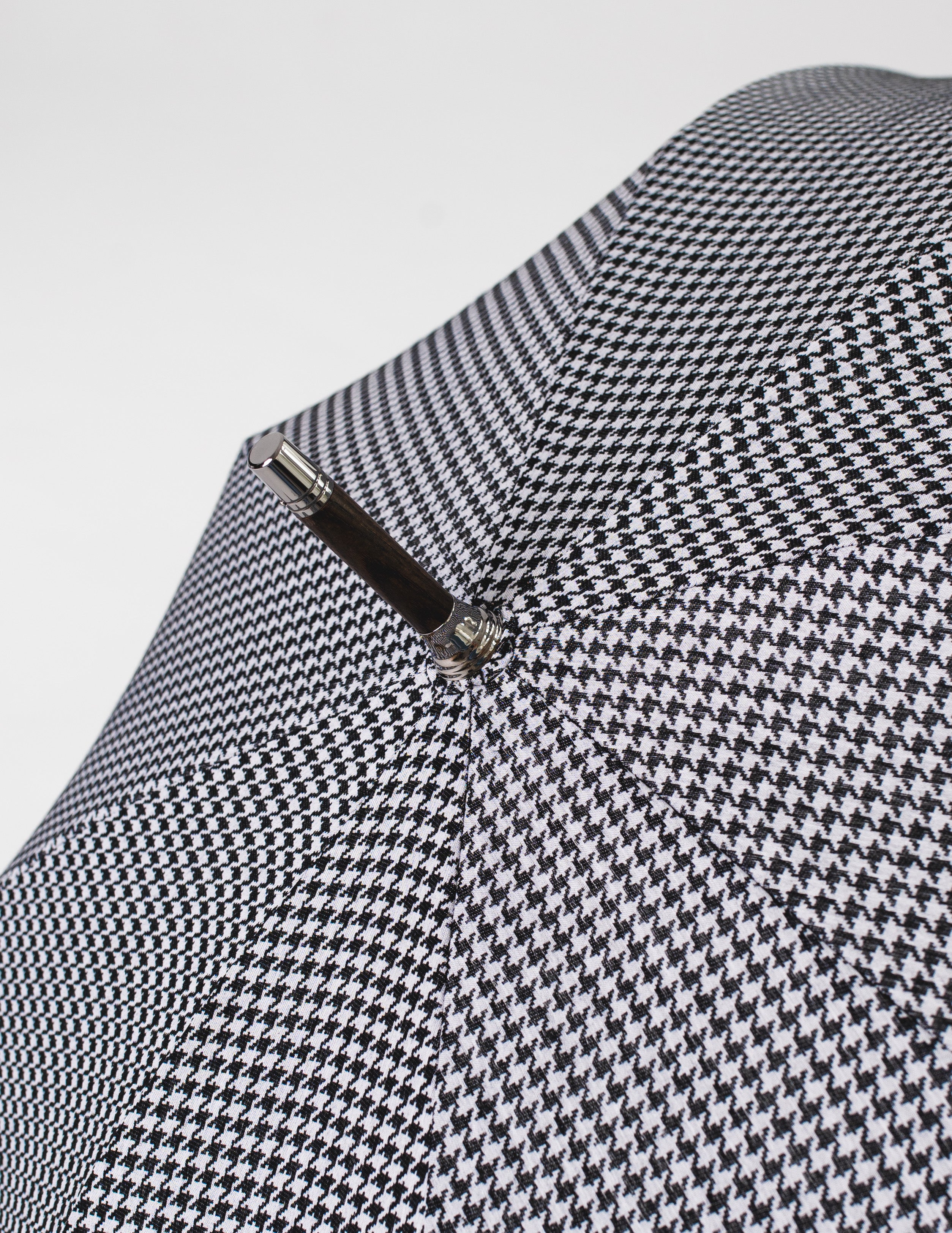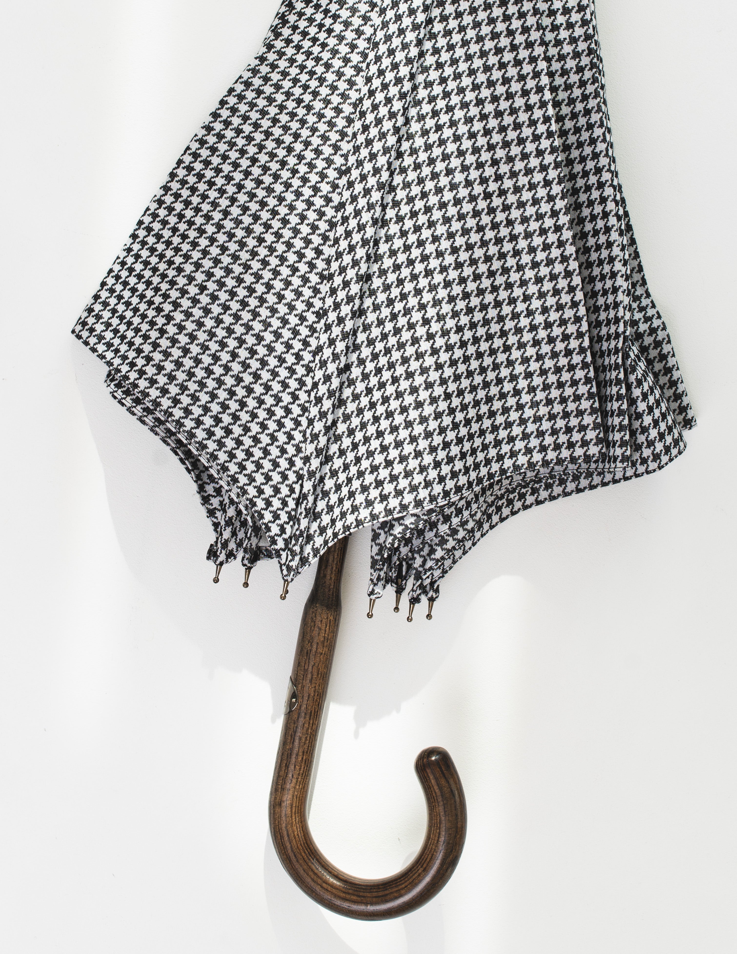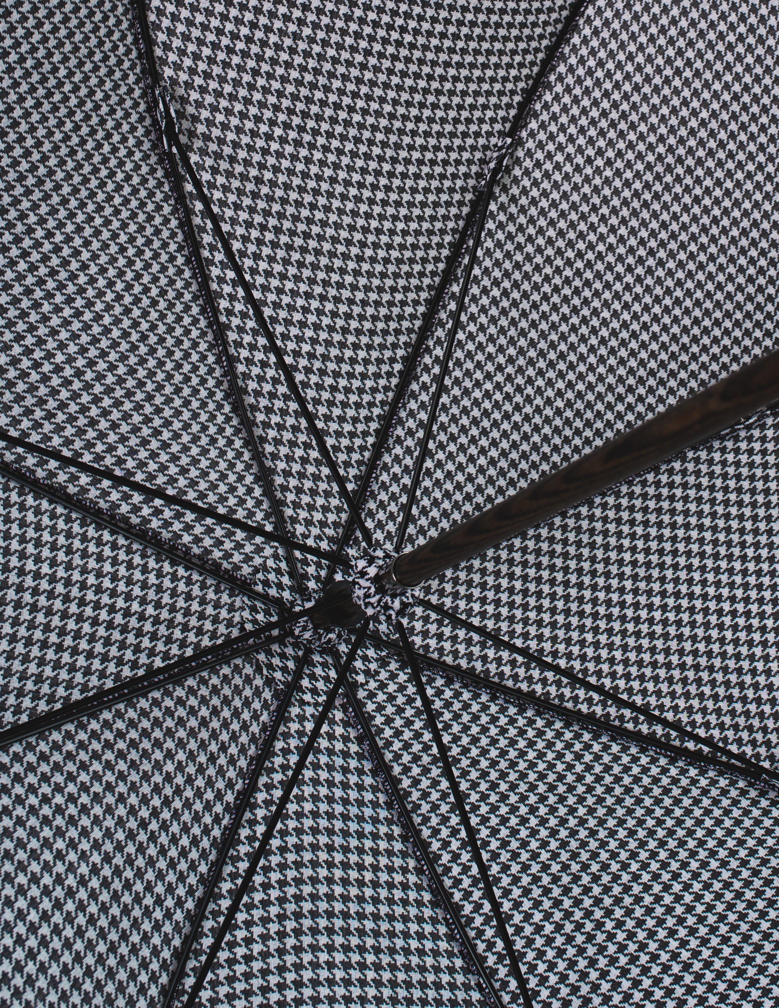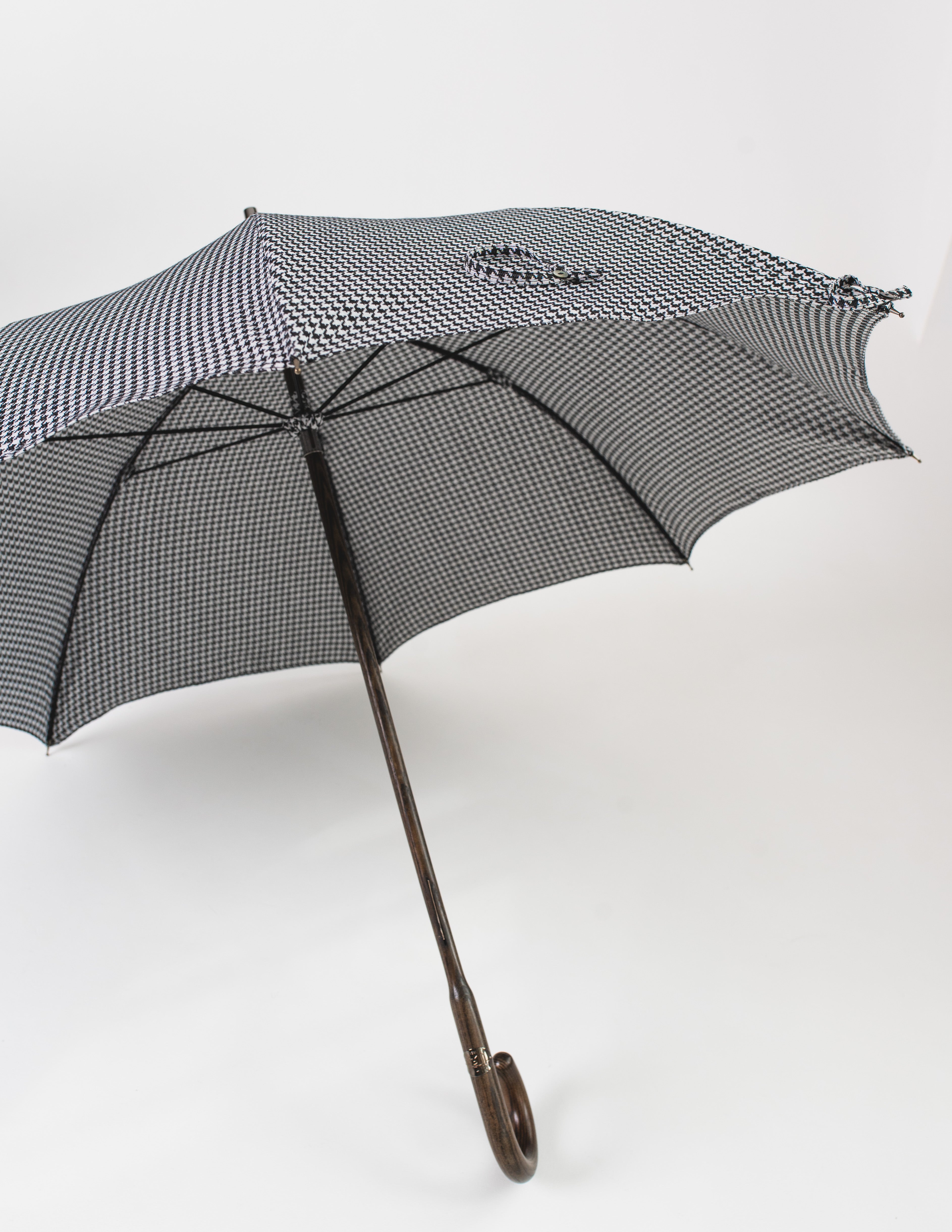 Ten parasol to esencja włoskiego rzemiosła, które od pokoleń zachwyca świat swoją perfekcją. Rączka, misternie wykonana z wypalanego drewna jesionowego, skrywa w sobie duszę natury i kunszt pracy ludzkich rąk. Czasza w ponadczasowy wzór czarno-białej pepitki, uszyta z tkaniny pochodzącej z Como, emanuje subtelną elegancją, która przyciąga spojrzenia.