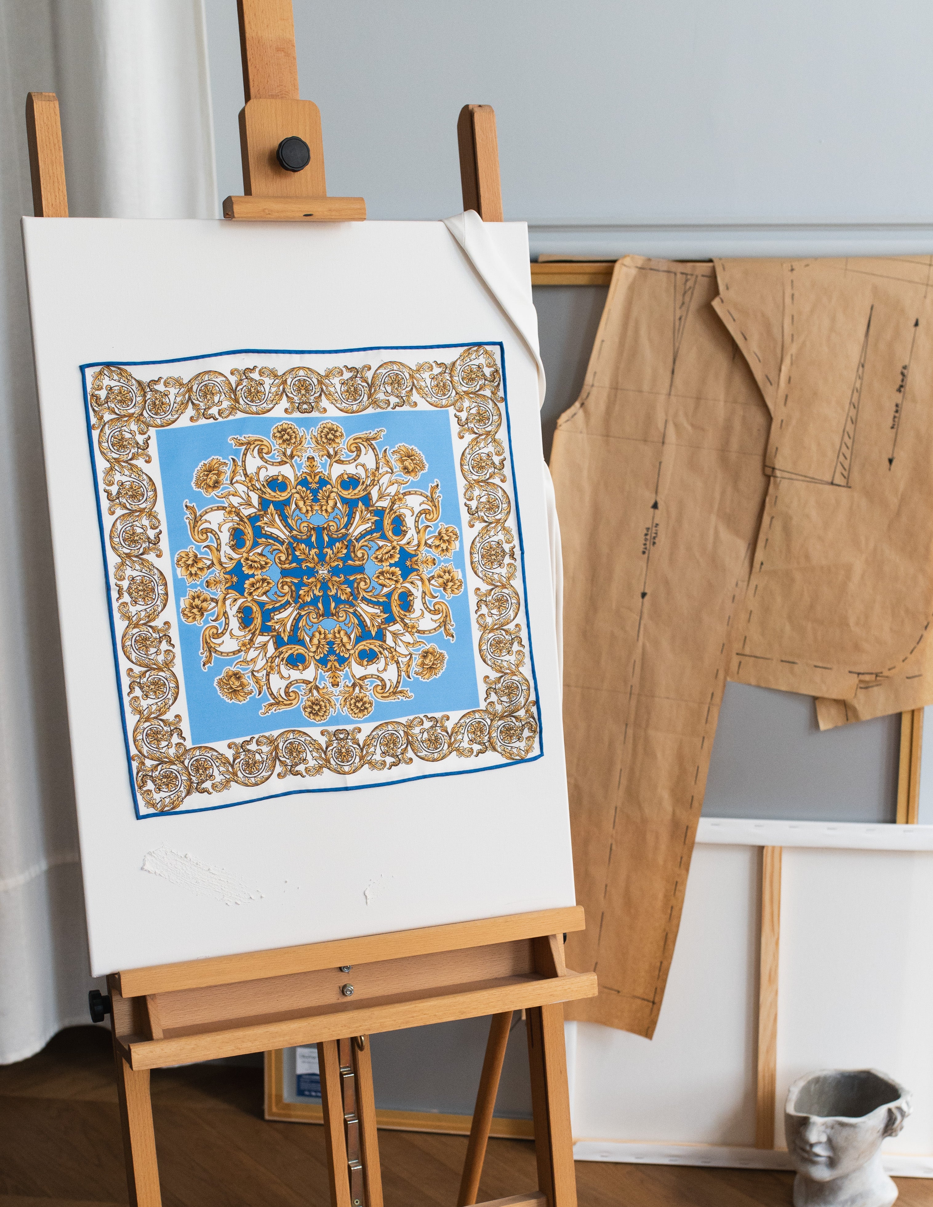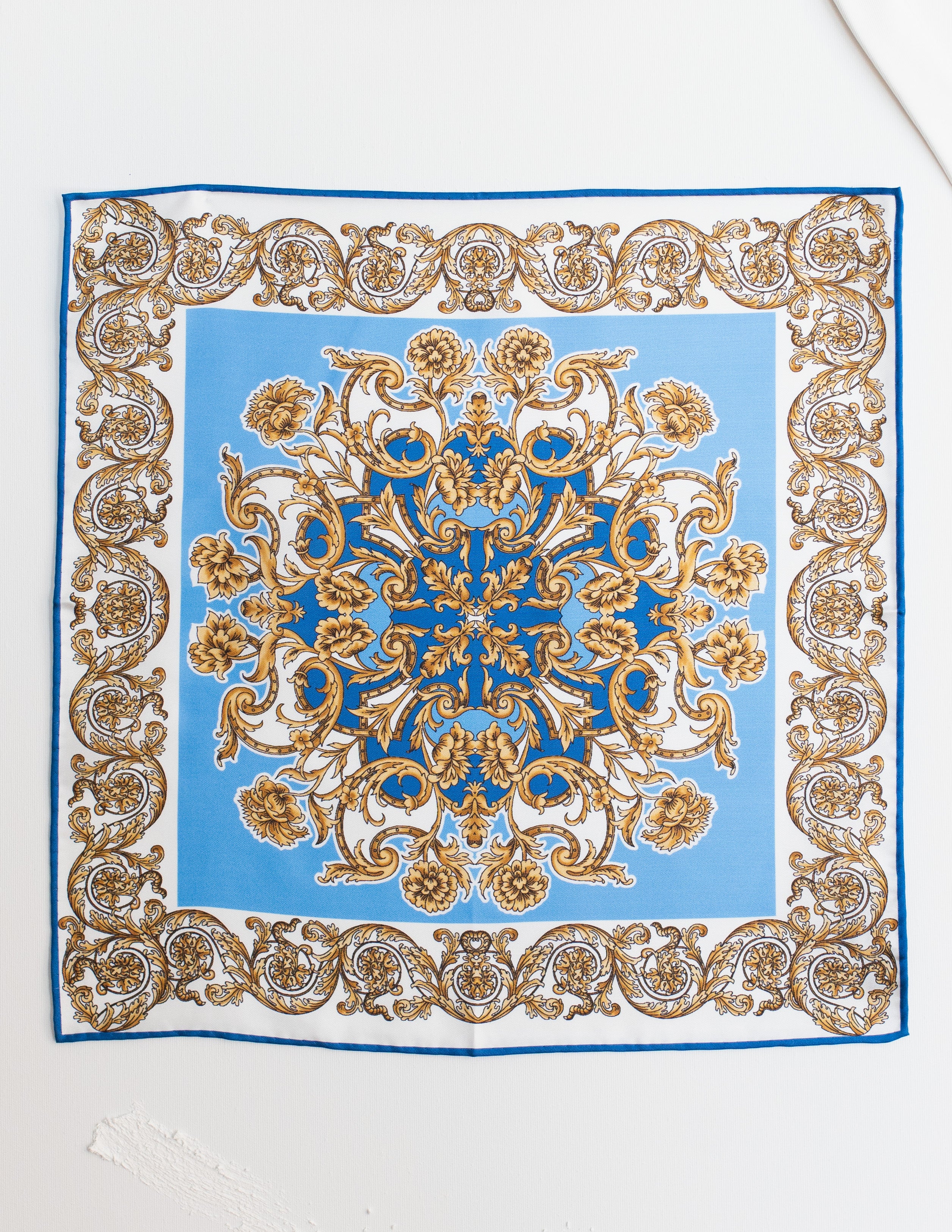 „Baroque Bloom” to poszetka inspirowana bogactwem ornamentów barokowych, które splatają się w symetryczny, kalejdoskopowy wzór. Odcienie błękitu i złota tworzą elegancką i wyrafinowaną kompozycję, przypominającą o klasycznej sztuce zdobniczej. Ta poszetka jest symbolem luksusu i doskonałości.