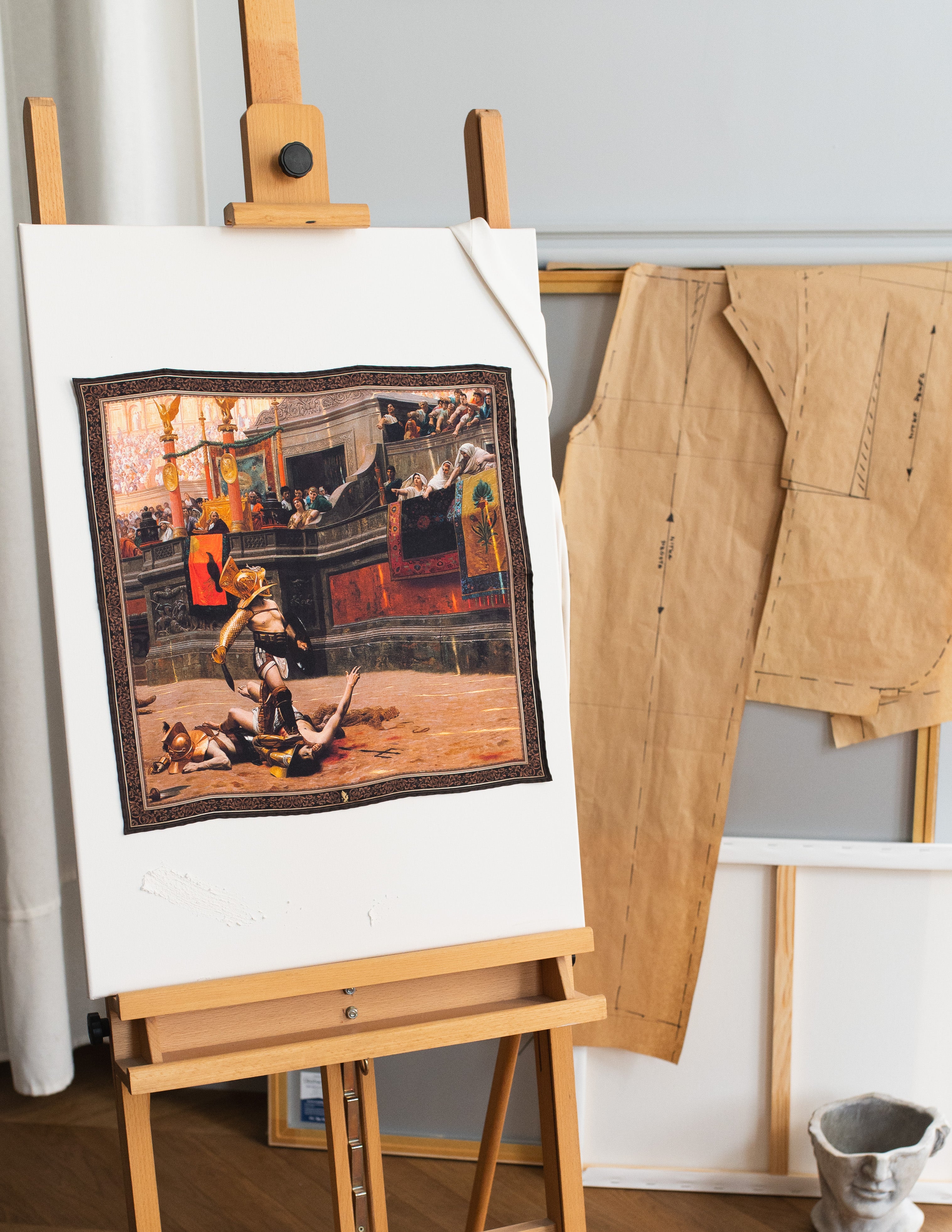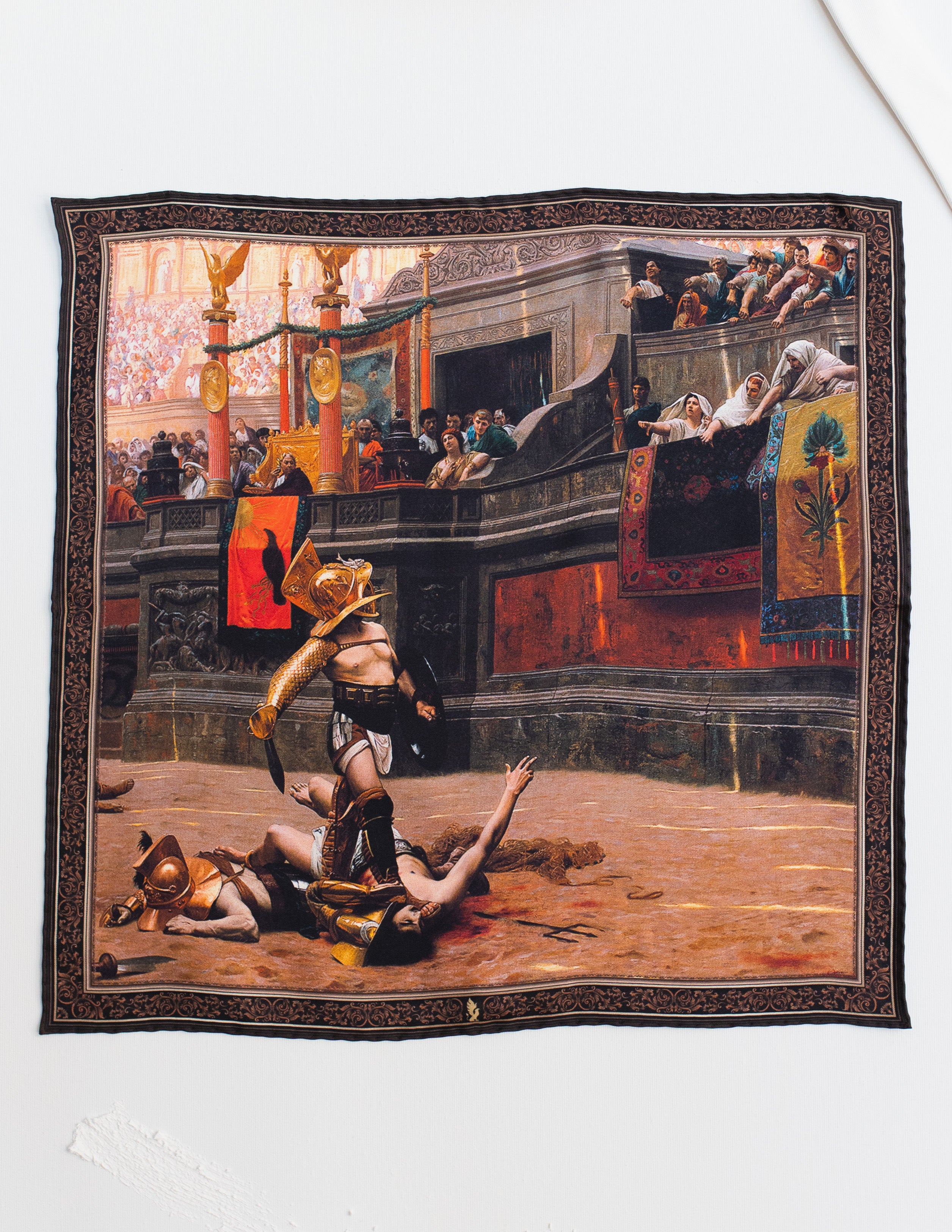 Ta jedwabna poszetka przedstawia dramatyczną scenę autorstwa Jean-Léona Gérôme’a, znanego malarza akademickiego, zatytułowaną „Pollice verso”. Obraz ukazuje moment w starożytnym Rzymie, w którym tłum, za pomocą gestu kciuka (pollice verso), decyduje o losie gladiatora – czy ma żyć, czy zginąć. Gérôme, mistrz detali i realizmu, uchwycił moment napięcia, który pokazuje brutalność i mroczną stronę rzymskich igrzysk.