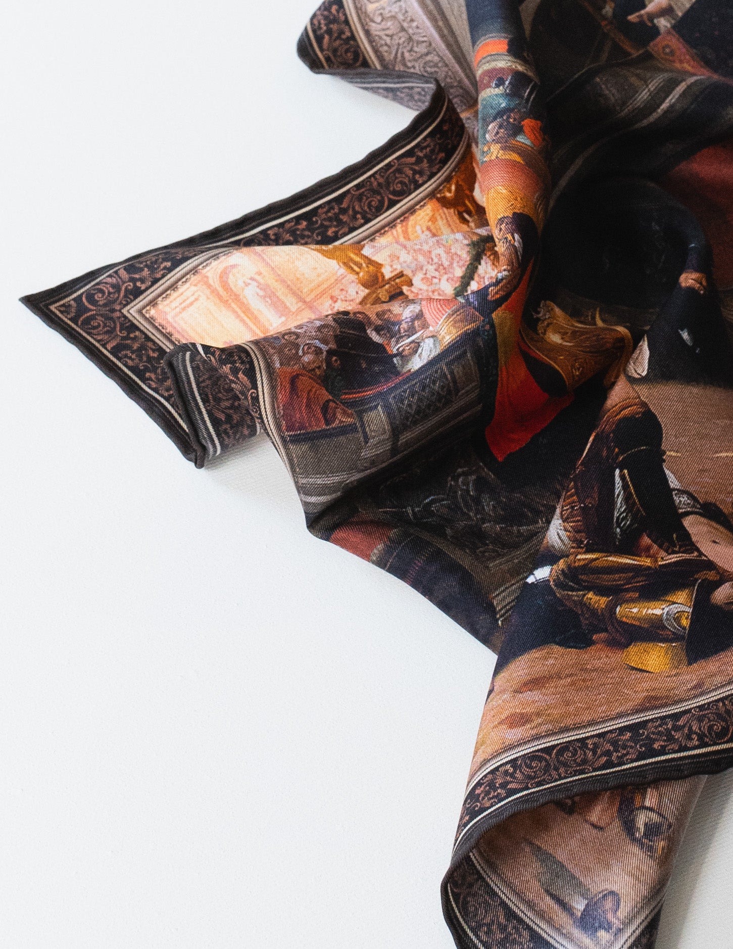 Poszetka o wymiarach 42x42 cm prezentuje się elegancko każdej marynarce, dodając jej wyrazistego charakteru. Dzięki intensywnym kolorom i dramatyzmowi dzieła, poszetka jest niezwykle uniwersalna, pasując do wielu eleganckich stylizacji. Produkowana w Macclesfield w Anglii, z ręcznie obszywanymi brzegami, stanowi połączenie sztuki, historii i doskonałego rzemiosła.