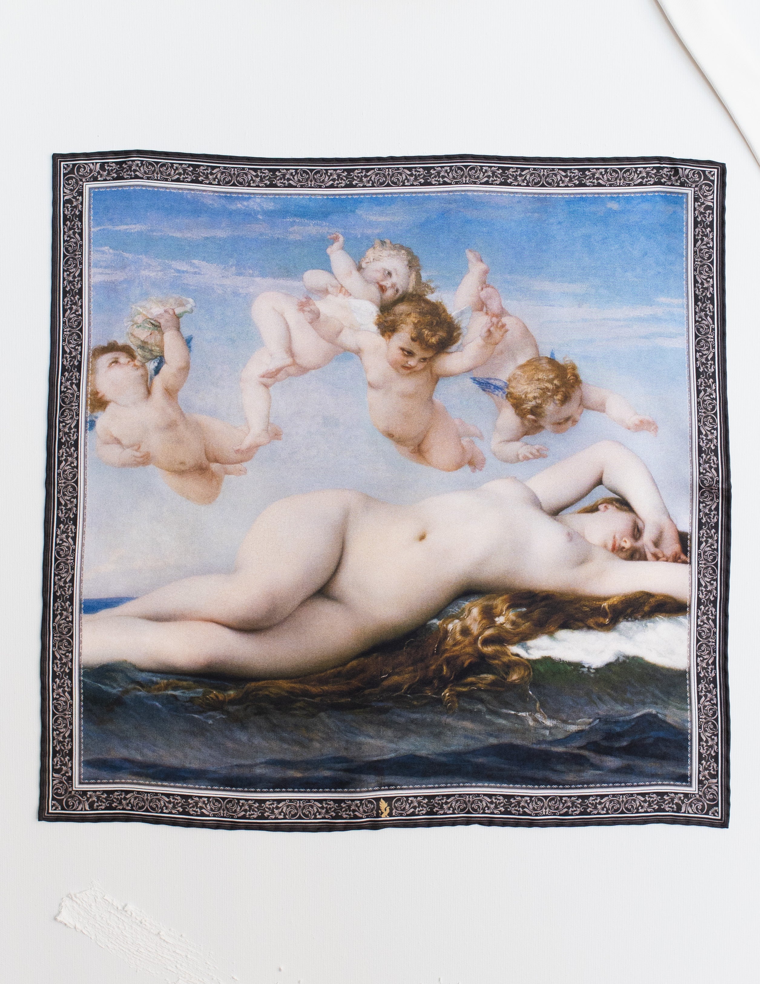 Ta jedwabna poszetka przedstawia słynne dzieło Alexandre’a Cabanela, "The Birth of Venus", które ukazuje mitologiczną narodziny bogini Wenus z morza. Obraz, namalowany w 1846 roku, oddaje klasyczny kanon piękna i elegancji, ukazując Wenus unoszącą się na falach oceanu, otoczoną aniołkami. Dzieło Cabanela, będące przykładem akademickiego realizmu, jest pełne subtelności, zarówno w kolorystyce, jak i w przedstawieniu postaci.