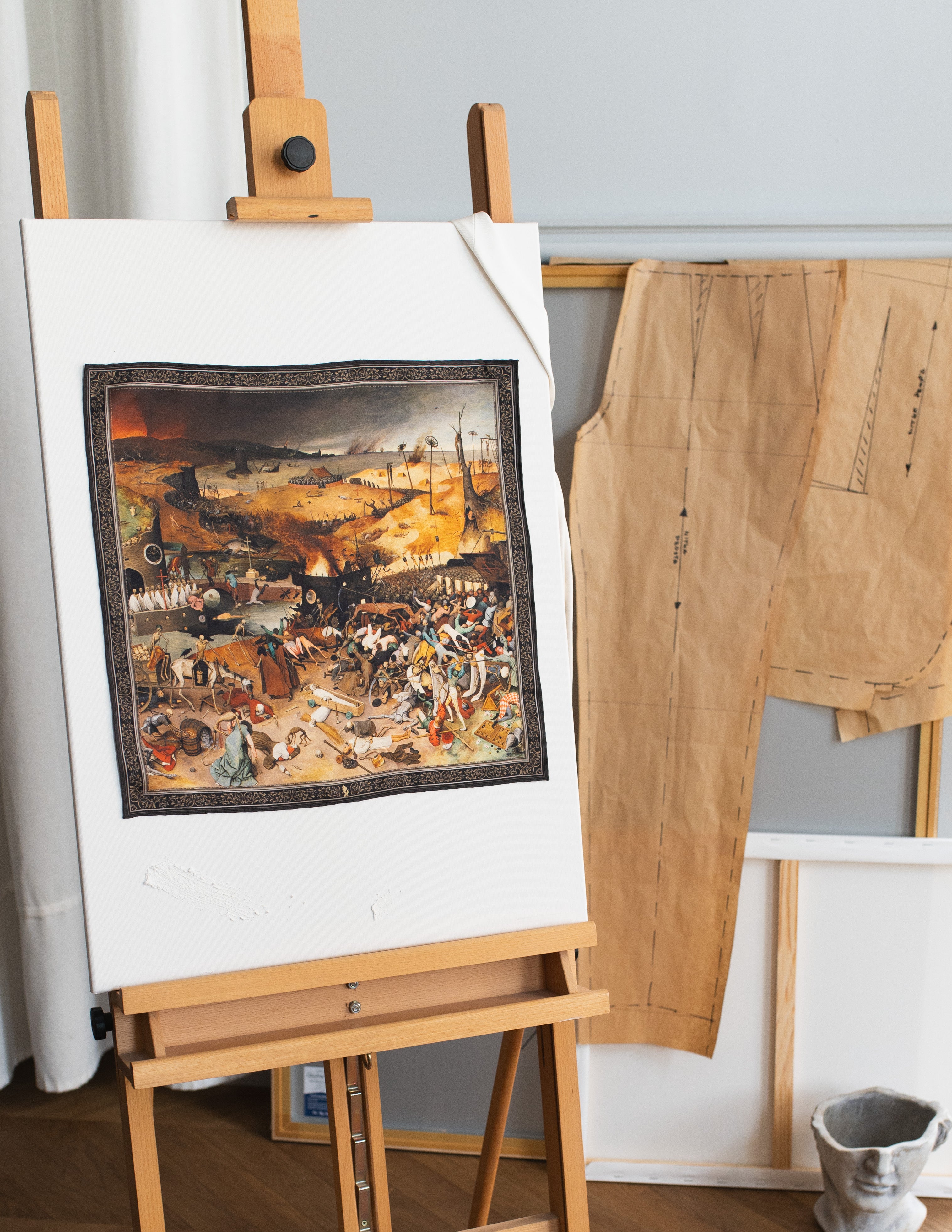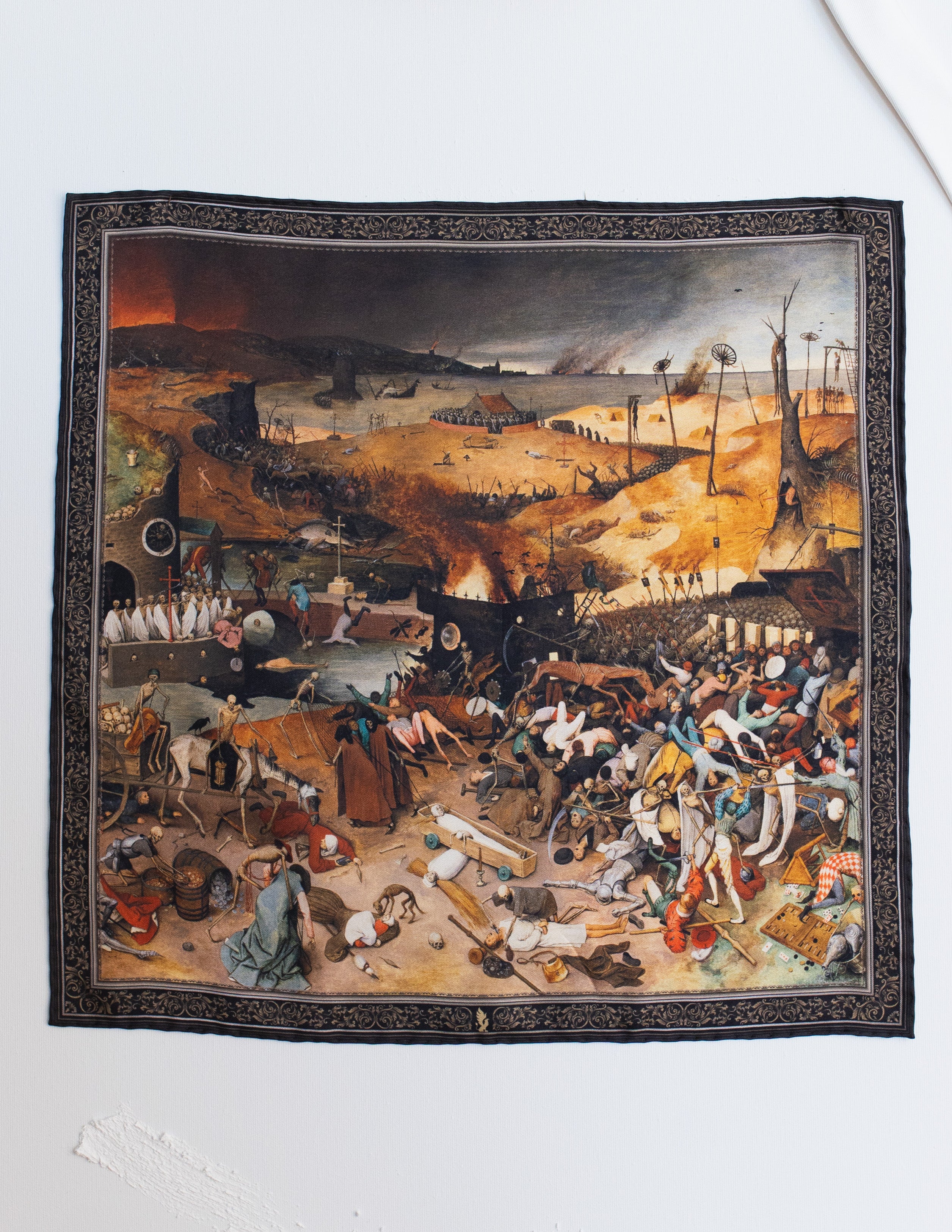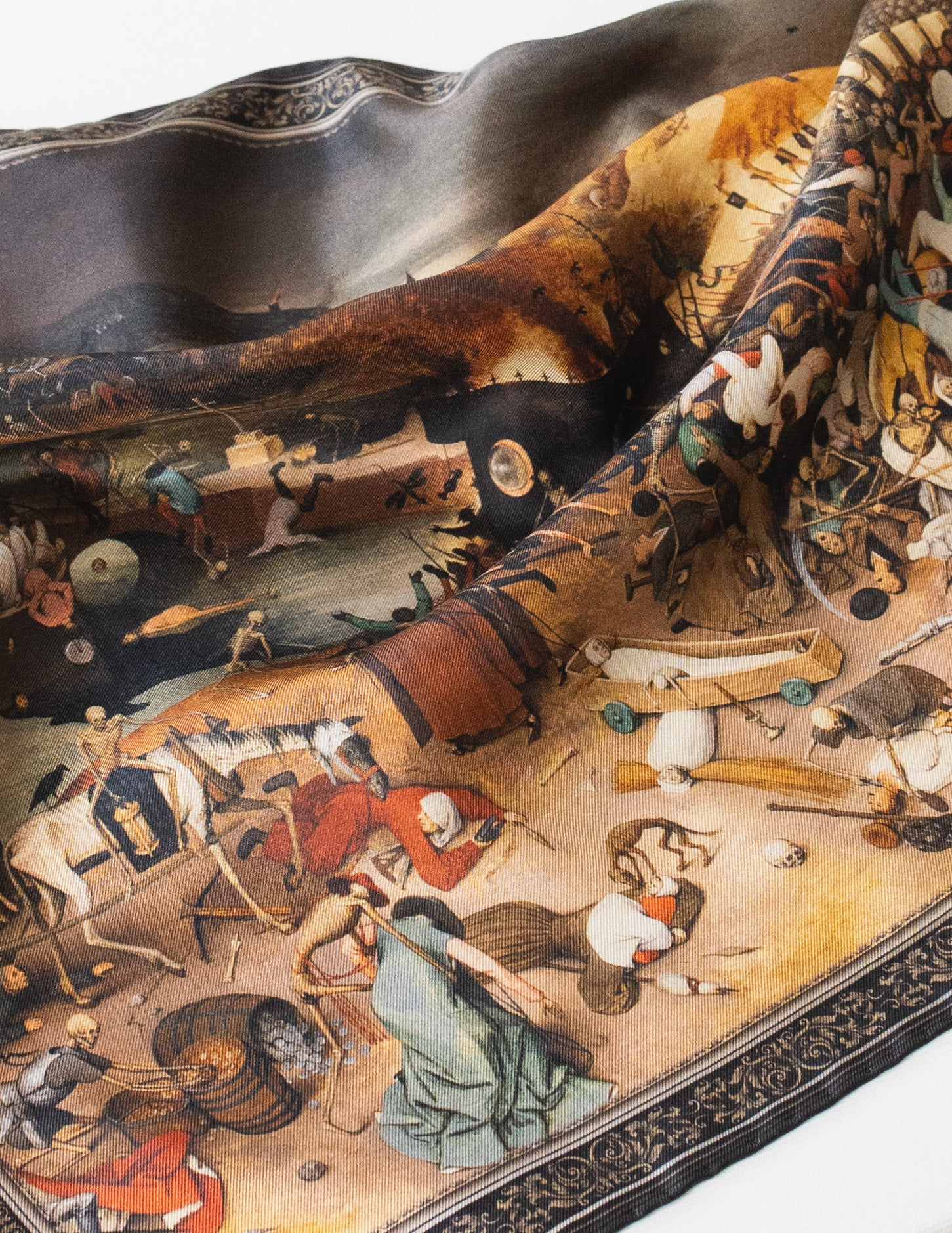 Ta jedwabna poszetka przedstawia dramatyczne i pełne mroku dzieło Pietera Bruegla starszego, znane jako „Triumf śmierci”. Obraz, powstały w XVI wieku, ukazuje apokaliptyczną wizję śmierci, która rozprzestrzenia się po świecie, niszcząc wszystko na swojej drodze. Bruegel, mistrz flamandzkiego renesansu, ukazał śmierć nie tylko w jej klasycznym, naturalnym obrazie, ale także jako siłę destrukcji, która pochłania zarówno ludzi, jak i całą cywilizację.