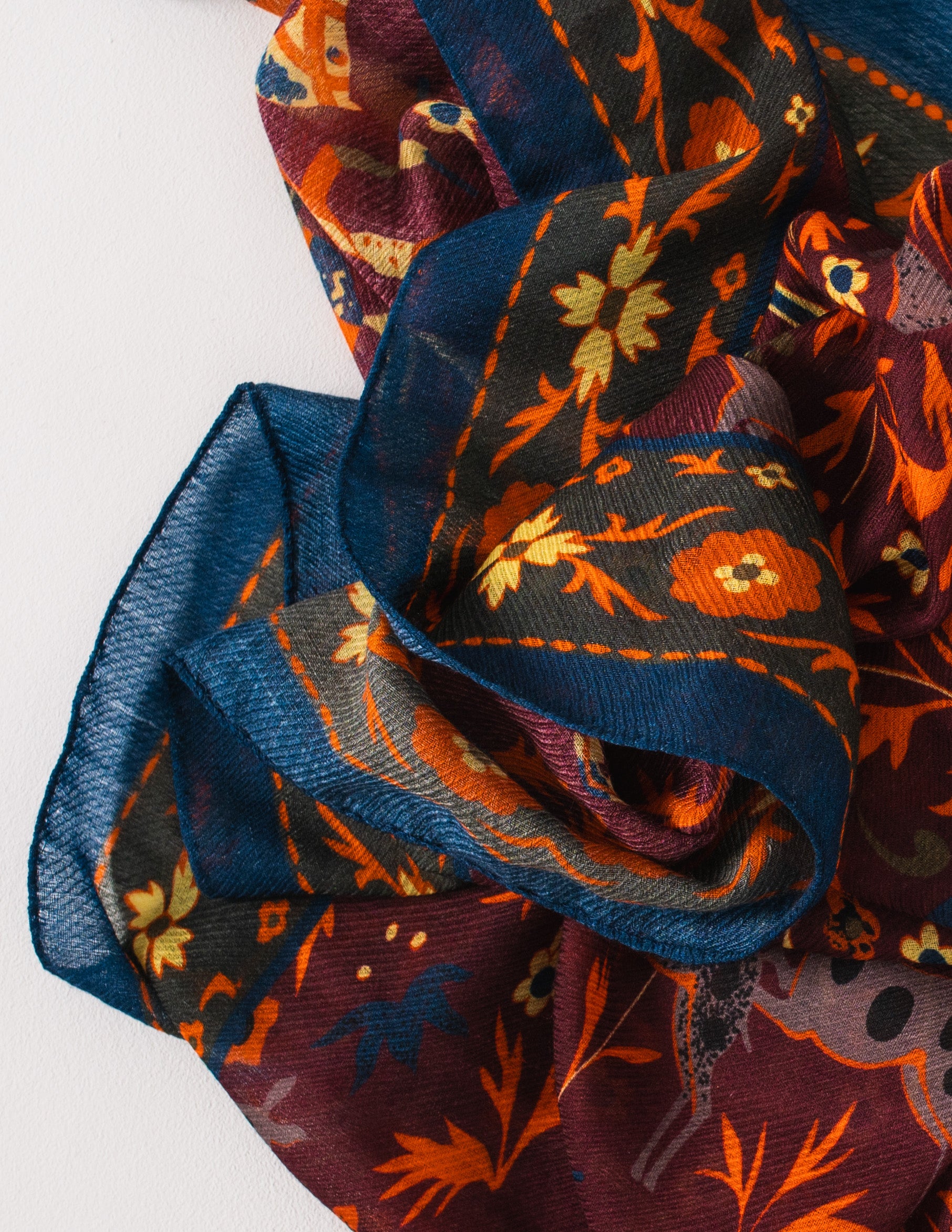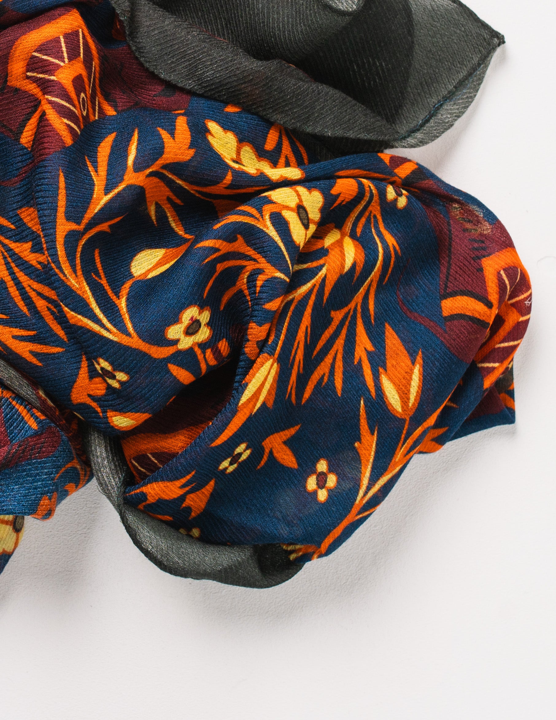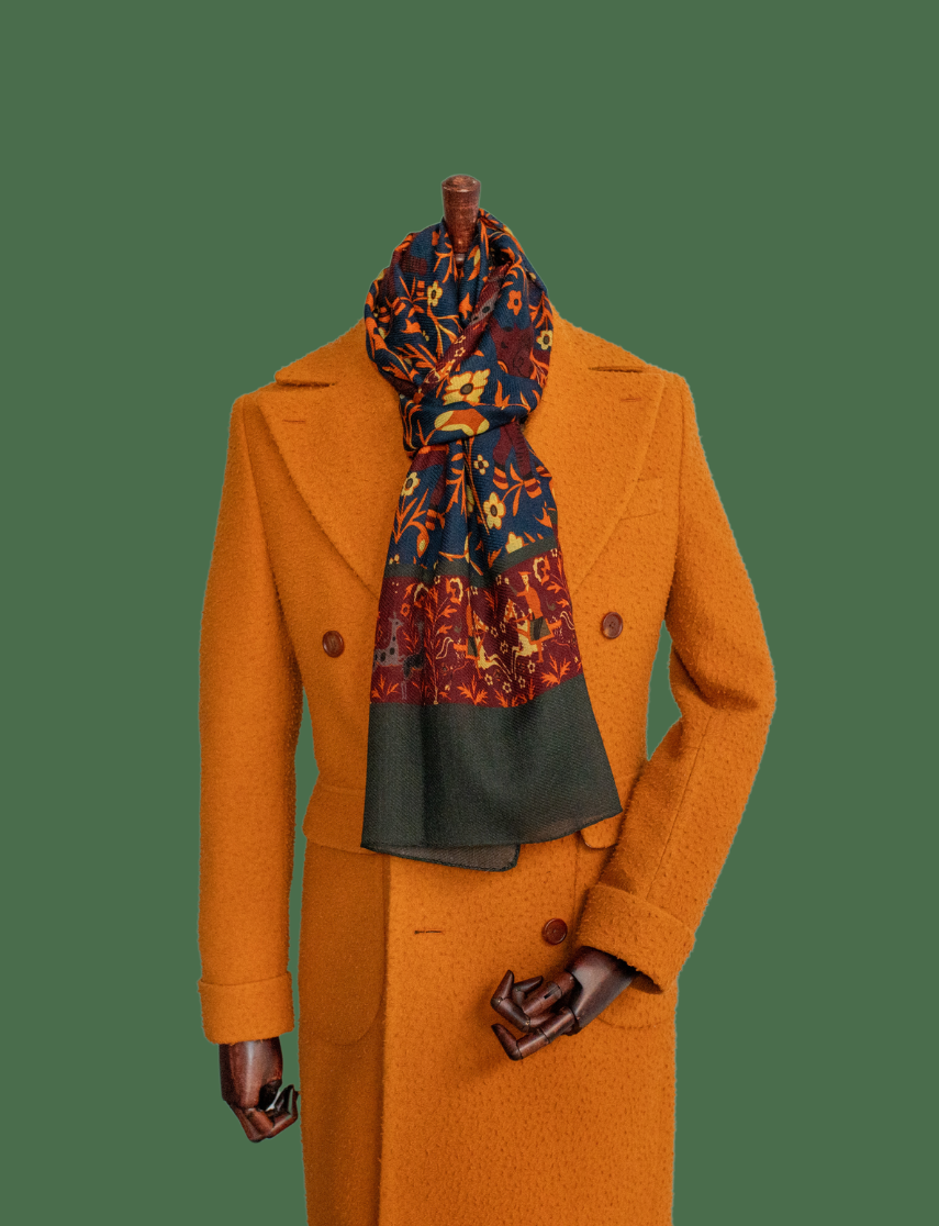 Szalik z roślinnym wzorem w odcieniach ciemnej zieleni, granatu, rdzawej czerwieni, pomarańczu i musztardy. Górną część zdobi gęsty, drobny deseń kwiatów i liści, ku dołowi przechodzący w spokojniejszy, ciemnozielony pas. Kolorystyka dobrze współgra z płaszczami w kolorze camel, ochry, ciemnej zieleni, brązu oraz granatu, dodając im jesiennej głębi.