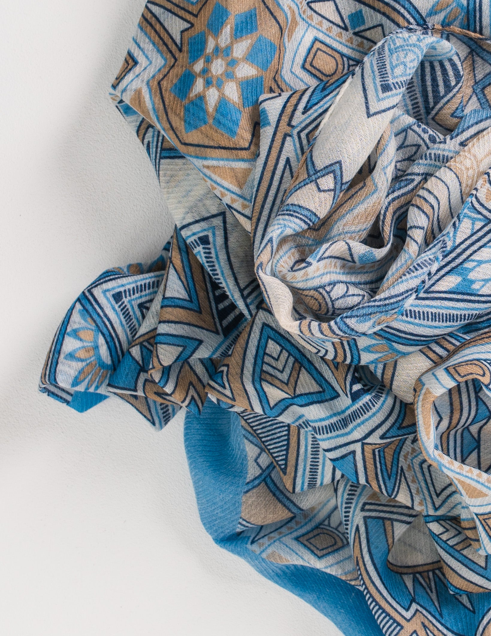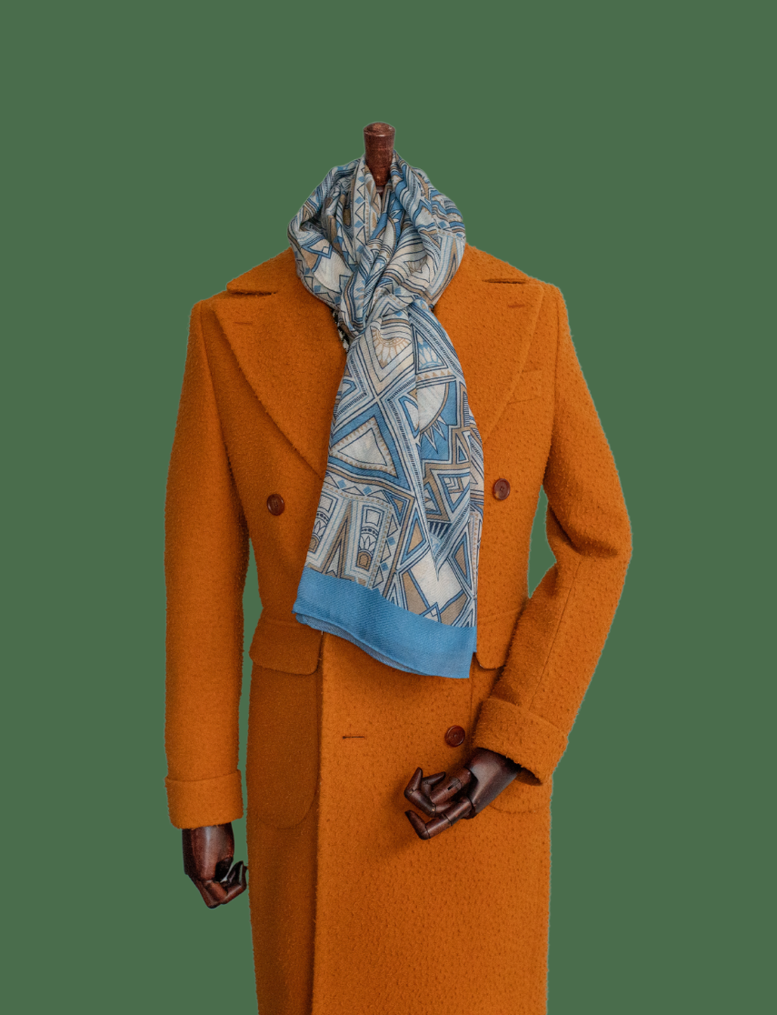 Szalik z geometrycznym wzorem w odcieniach jasnego błękitu, szarości i piaskowego beżu. Zakończony gładką, błękitną krawędzią, która dodaje całości świeżości i dobrze współgra z płaszczami w kolorze camel, ochry, granatu czy klasycznej szarości. Wzór jest wyrazisty, ale utrzymany w stonowanej, chłodniejszej palecie, dzięki czemu szalik łatwo wchodzi w różne stylizacje.
