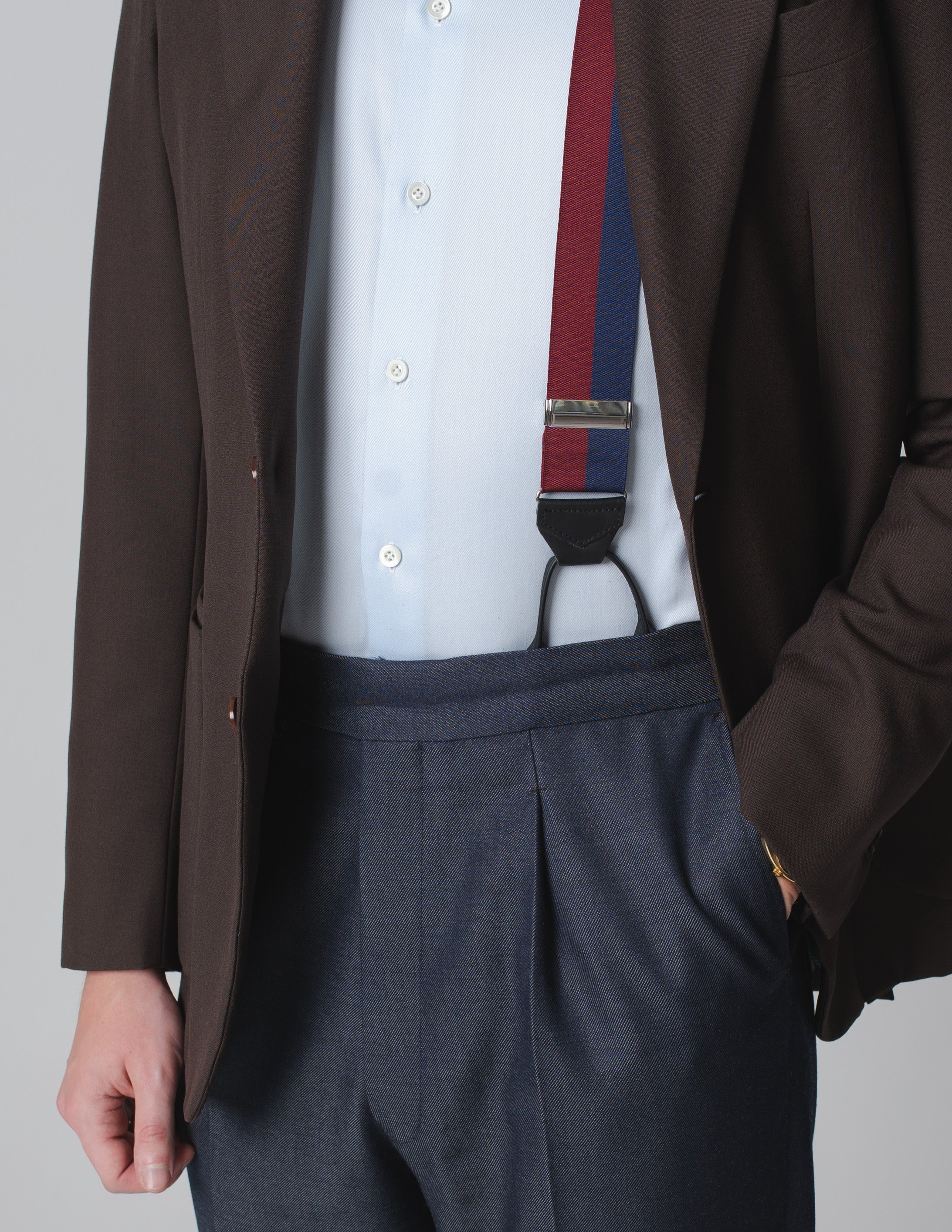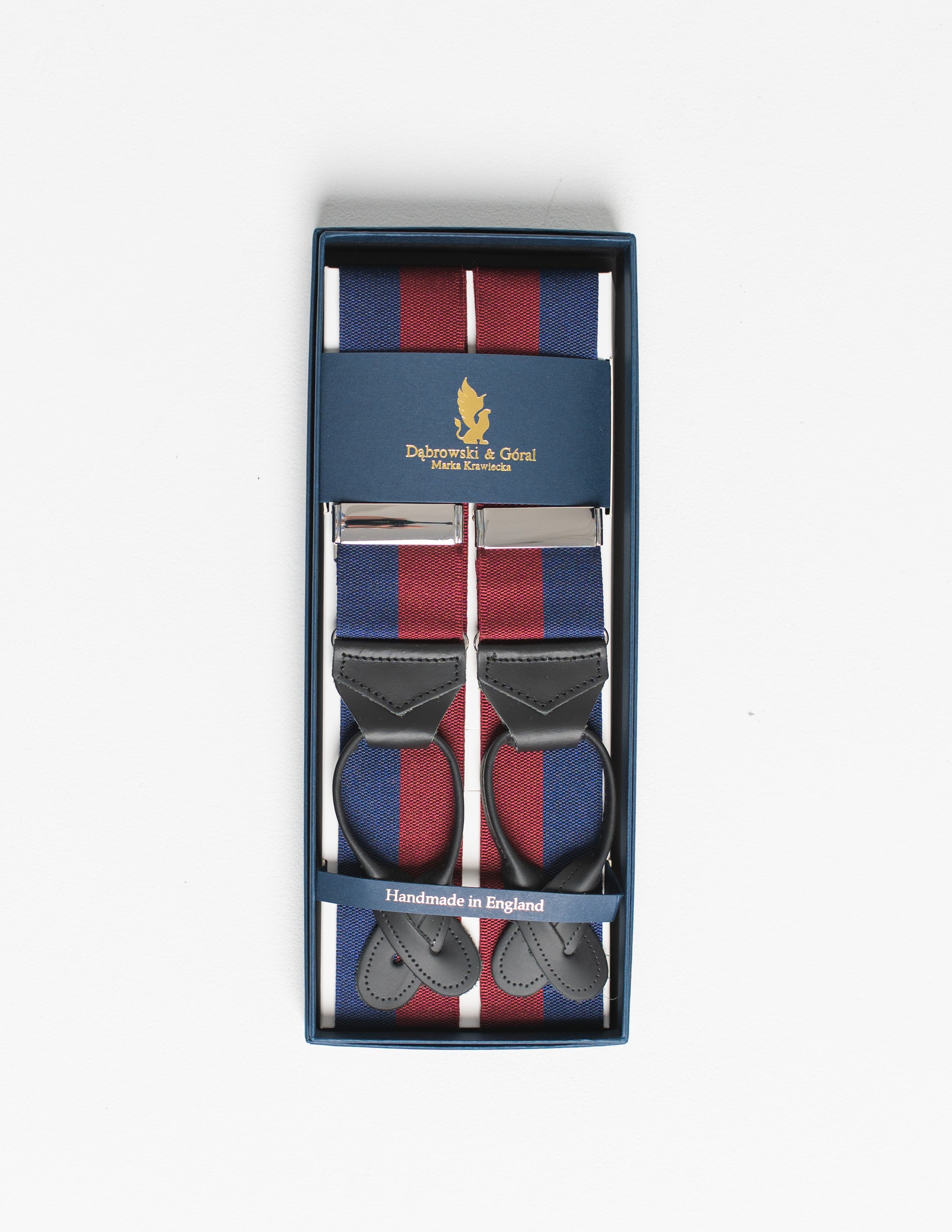 Model "Oxford Stripes" charakteryzuje się subtelnym i wyrafinowanym wzorem w szerokie, czerwono-granatowe pasy, które emanują uczelnianą elegancją i brytyjskim szykiem. Szelki wykonane z wysokiej jakości tkanin i wykończone skórzanymi detalami gwarantują trwałość, komfort oraz niezawodność. Dzięki regulowanym paskom idealnie dopasują się do każdej sylwetki.