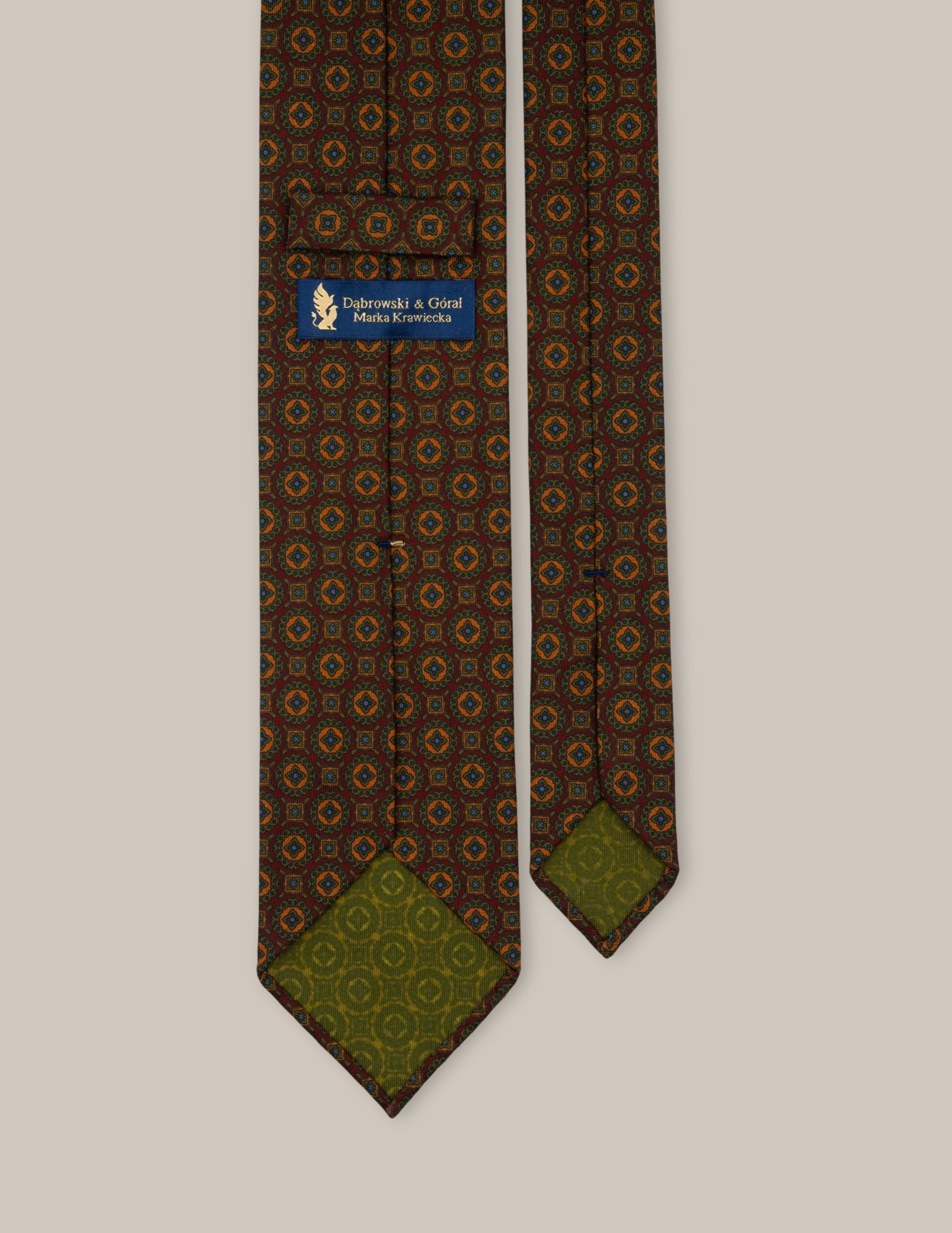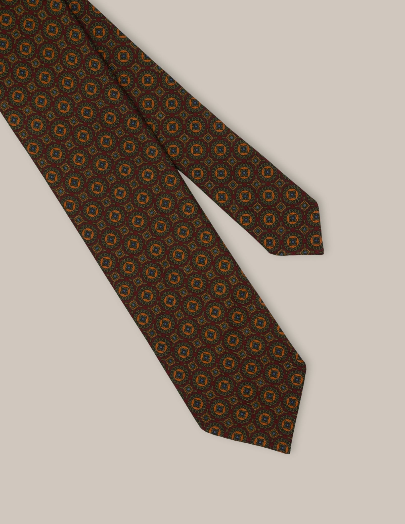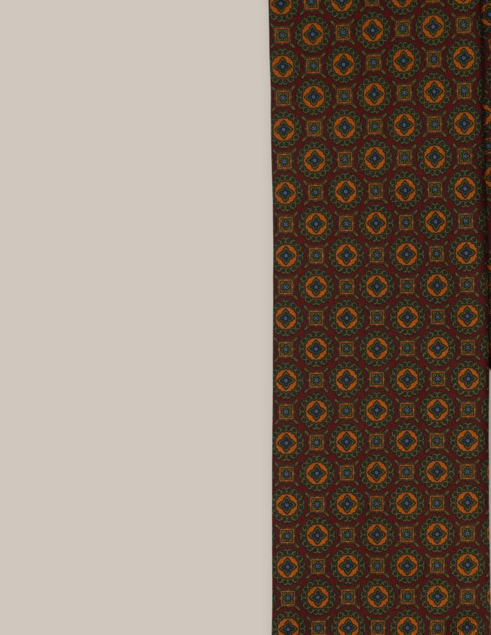 Krawat Barolo Medaglione zachwyca gęstym mikrowzorem na głębokim, bordowo-brązowym tle. Rytmicznie rozmieszczone medaliony w odcieniach złamanej pomarańczy, niebieskiego i zieleni tworzą bogatą, niemal biżuteryjną kompozycję, która przywodzi na myśl wnętrza starych włoskich pałaców. To idealny wybór do ciemnego granatu, brązu czy oliwkowej marynarki – dodaje charakteru, nie odbierając stylizacji elegancji.