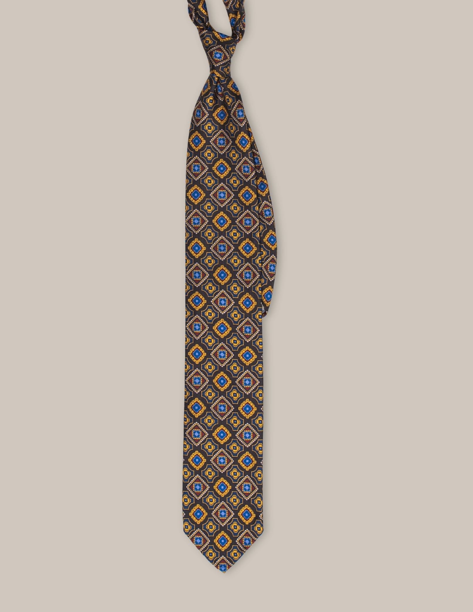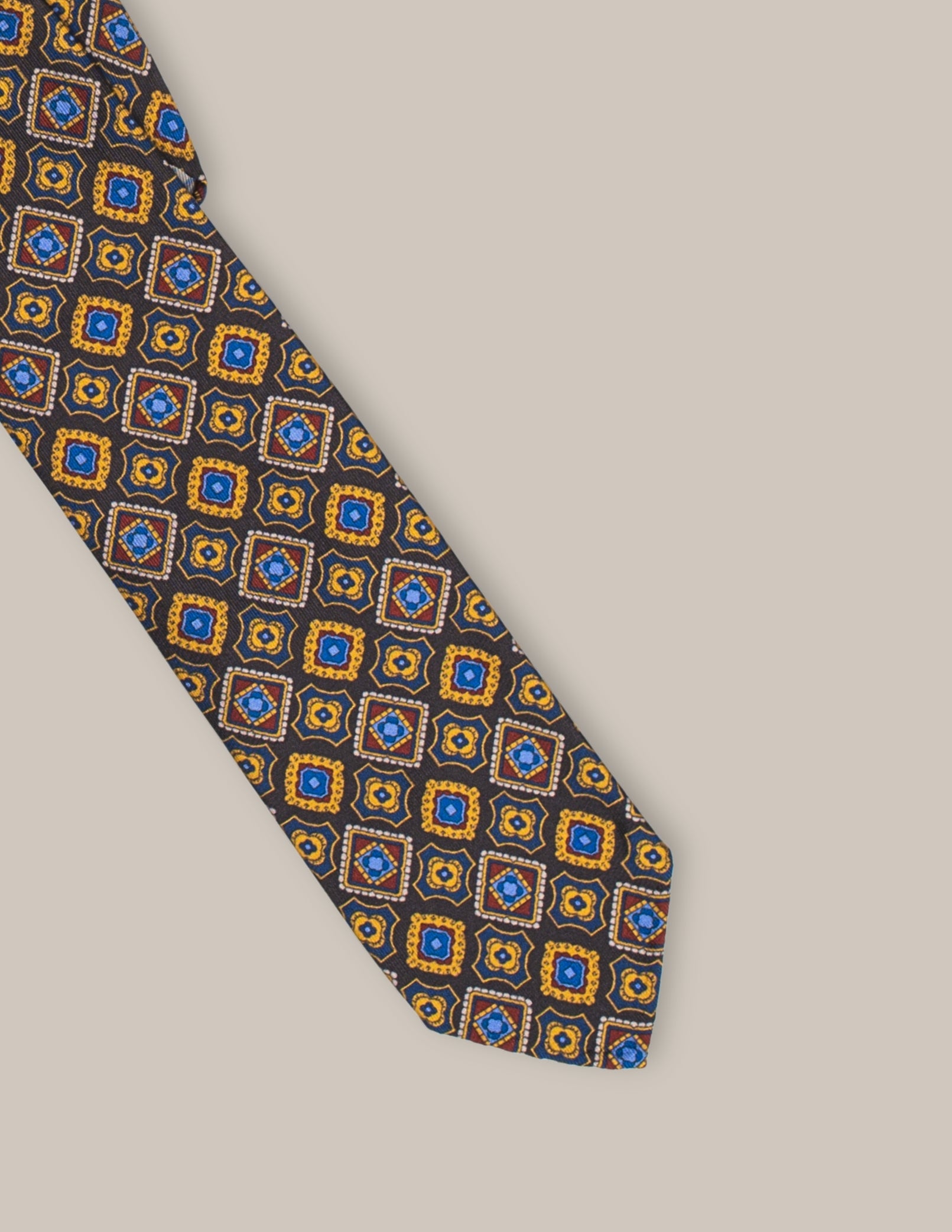 Krawat Notte Dorata prezentuje eleganckie, ciemnobrązowe tło zdobione złocistymi i niebieskimi geometrycznymi wzorami. Wyrazisty, ale klasyczny design sprawia, że jest doskonałym dodatkiem do każdej marynarki, dodając jej unikalnego szyku i wyrafinowania. Idealny na wieczorne wyjścia, formalne spotkania lub eleganckie okazje.