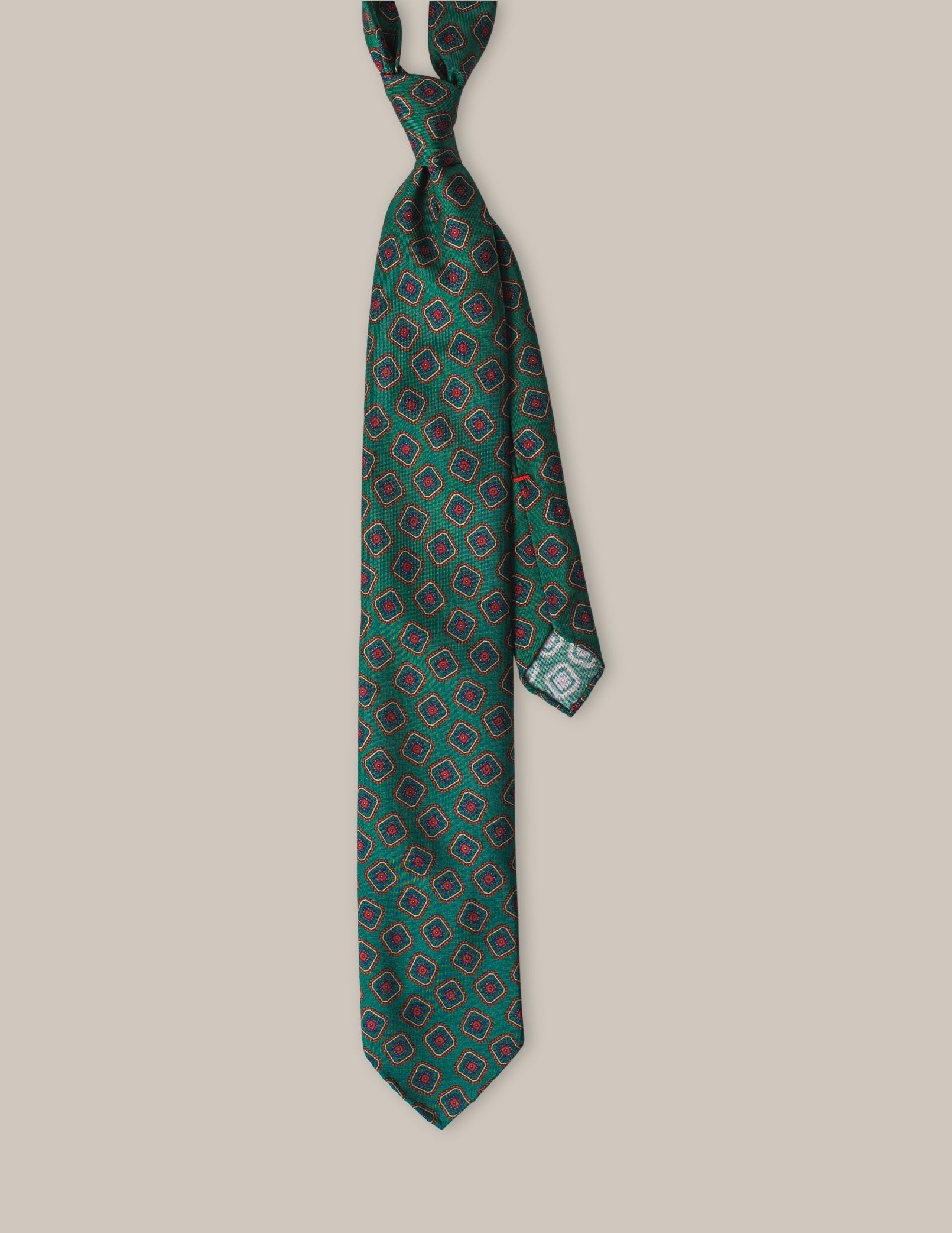 Krawat Verde Sottobosco wyróżnia się głębokim, leśnym odcieniem zieleni, który doskonale kontrastuje z geometrycznymi wzorami w odcieniach czerwieni i błękitu. Ta klasyczna, a zarazem oryginalna kompozycja sprawia, że krawat staje się wyjątkowym dodatkiem, przyciągającym wzrok i podkreślającym wyrafinowany styl.