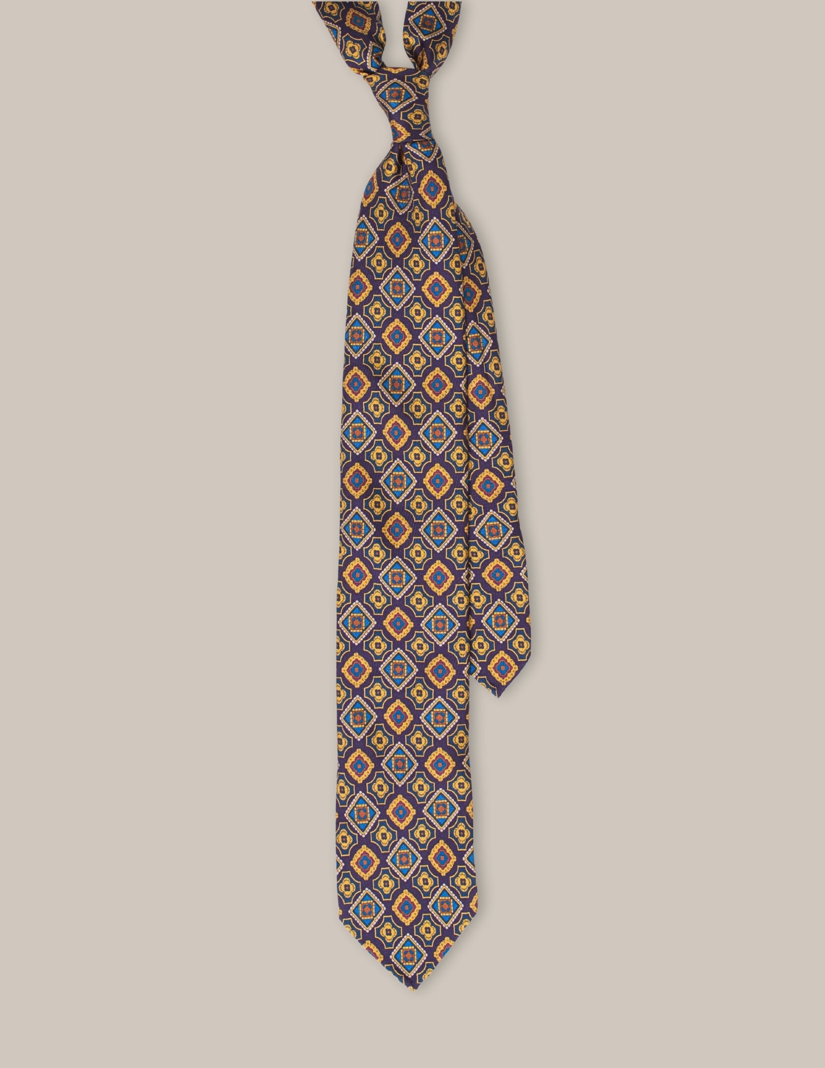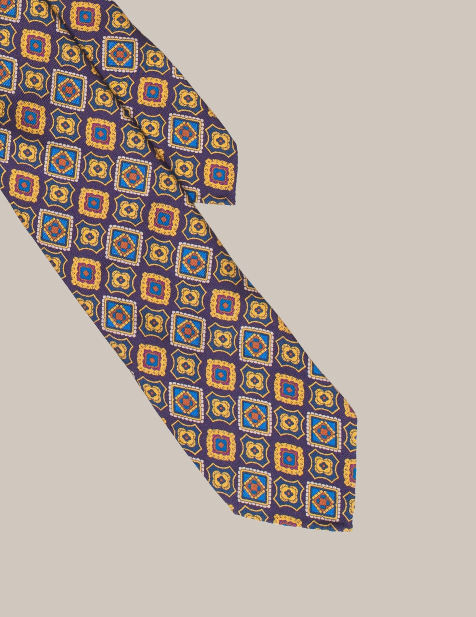 Viola Classico to krawat stworzony dla mężczyzn, którzy poszukują idealnego połączenia tradycji i odważnego wzornictwa. Wykonany w całości z jedwabiu, uszyty w konstrukcji 3-fold, wyróżnia się głębokim odcieniem fioletu zestawionym z geometrycznymi motywami w złocie, błękicie i subtelnej czerwieni. Ręcznie rolowane końcówki oraz brak podszewki nadają mu lekkości i świadczą o kunszcie włoskich rzemieślników, a klasyczny wełniano-bawełniany wkład zapewnia perfekcyjne ułożenie krawata.