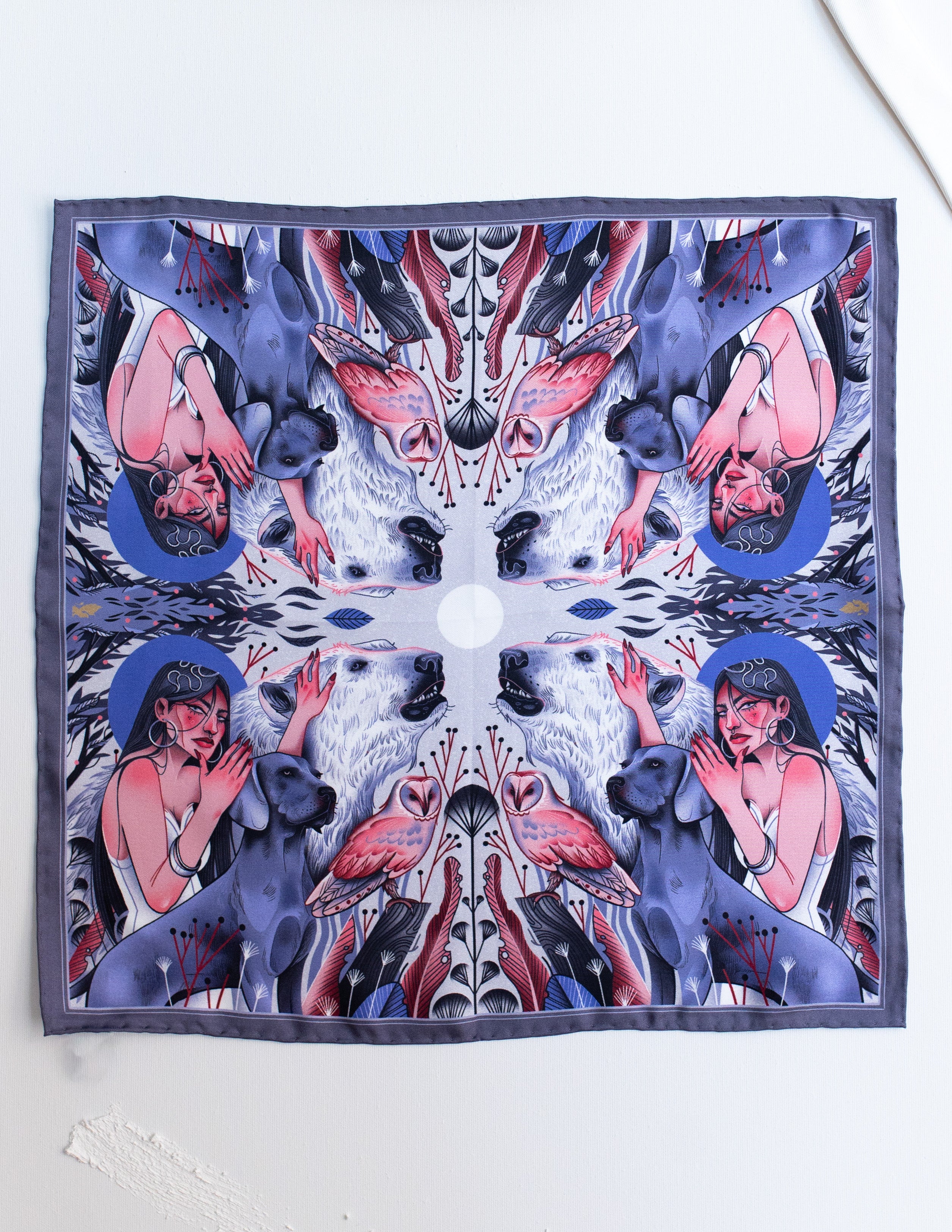 Jedwabna poszetka „Diament” autorstwa Izy Dudzik to wyraziste połączenie kobiecej siły i ponadczasowej elegancji. Wzór kalejdoskopowy, inspirowany chłodnym blaskiem diamentu, przedstawia sylwetkę jednej kobiety otoczonej wizerunkami wyżła weimarskiego i niedźwiedzia polarnego – symbolami wytrwałości i niezłomności. Delikatne odcienie bieli i srebra z nutą chłodnego błękitu tworzą kompozycję, która przyciąga uwagę i nadaje wyjątkowego charakteru.
