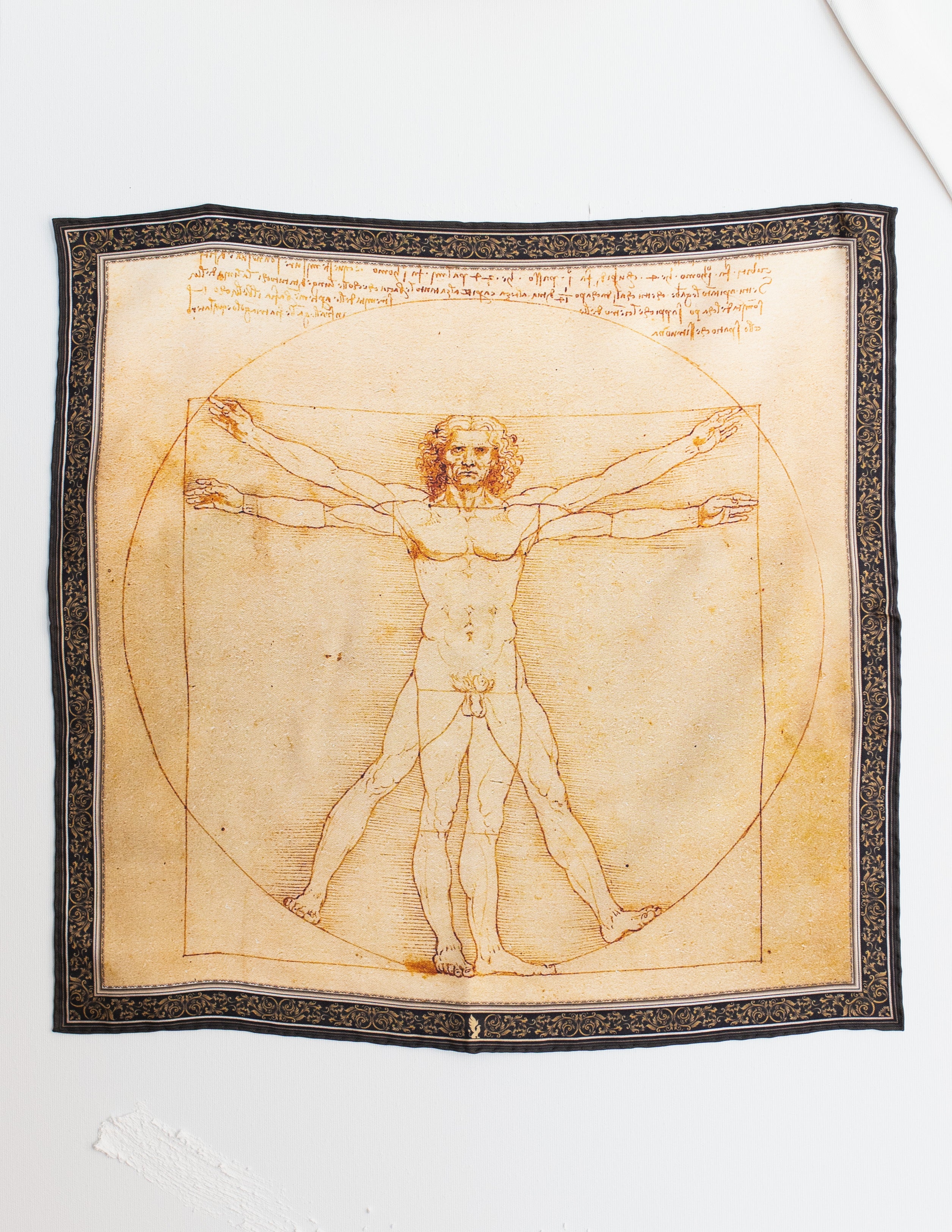 Ta jedwabna poszetka przedstawia słynny rysunek „Człowiek witruwiański” autorstwa Leonarda da Vinci, który stał się symbolem doskonałości proporcji ludzkiego ciała. Wykonany około 1490 roku, rysunek ukazuje mężczyznę w dwóch pozach, wpisanego w okrąg i kwadrat, co miało na celu przedstawienie idealnych proporcji ciała według zasad starożytnego architekta Witruwiusza. To dzieło nie tylko jest przykładem geniuszu artystycznego da Vinci, ale także jego fascynacji matematyką, anatomią i harmonią.