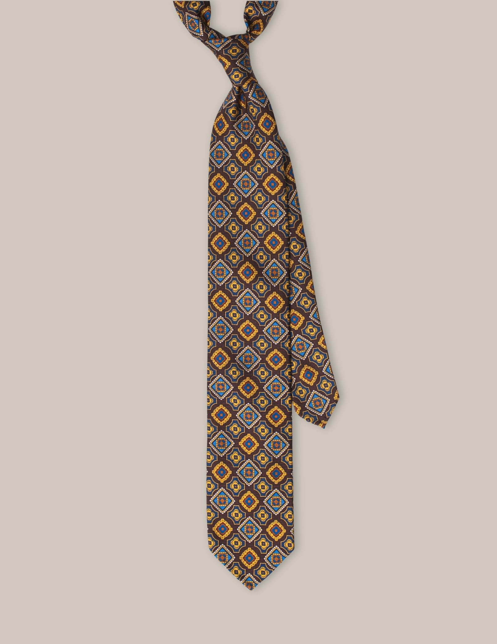 Krawat Marrone Geometrico to połączenie klasyki z wyrazistym wzornictwem. Wykonany w całości z jedwabiu, uszyty w konstrukcji 3-fold, wyróżnia się głębokim brązowym tłem, które harmonijnie współgra z geometrycznymi motywami w odcieniach złota, błękitu i czerwieni. Ręcznie rolowane końcówki oraz brak podszewki podkreślają jego lekkość i luksusowy charakter, a wełniano-bawełniany wkład zapewnia perfekcyjną strukturę.